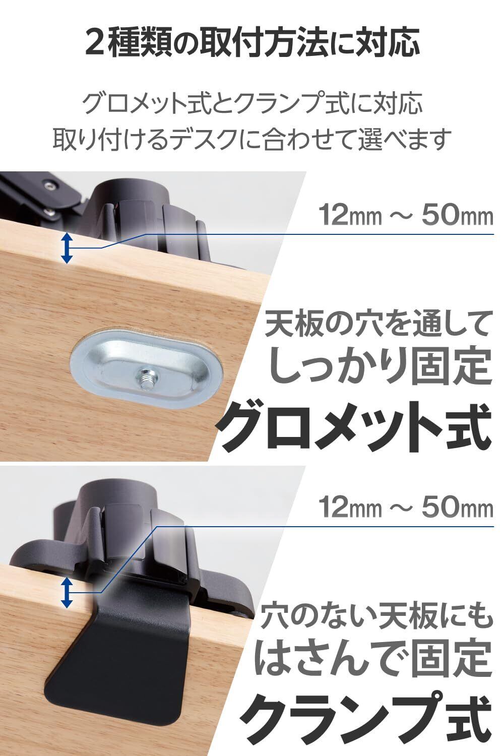 ■取り付け可能天板厚:クランプ(挟んで固定):12mm~50mm、グロメット(穴に通して固定):12mm~50mm