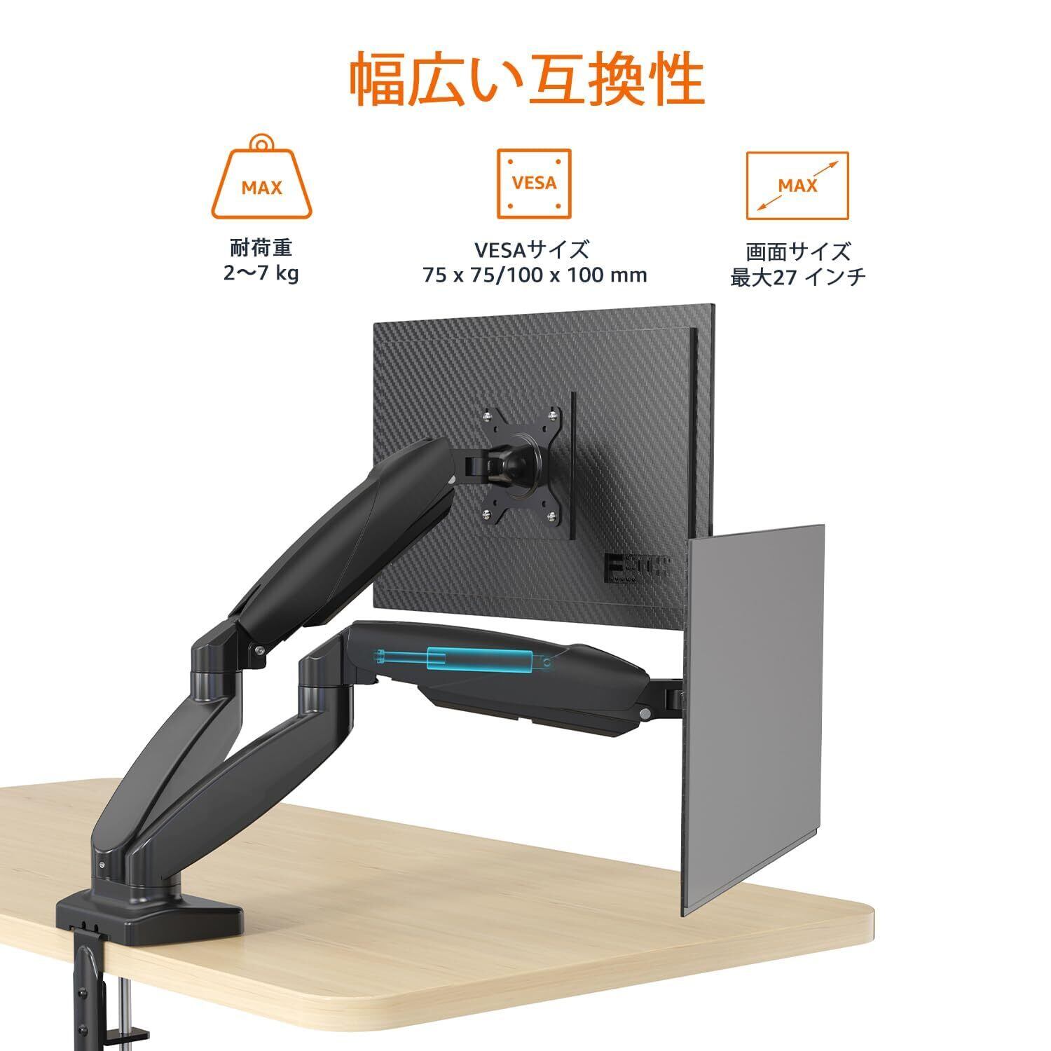 デュアルモニター デスクマウント: 38~69cmのLCD LEDスクリーン2台まで対応。関節式ガススプリングモニター用アームは、デュアルモニターの設定に省スペースで効率的なソリューションを提供します。