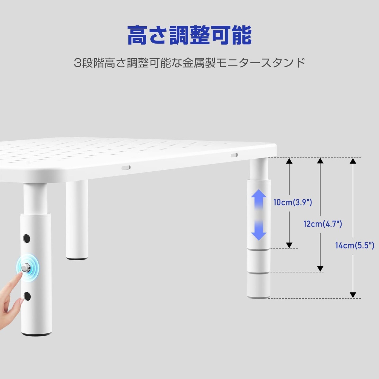 【人間工学に基づいたデザイン】- のタイプモニター台 卓上タイプは3段階(10/12/14cm)の高さ調節が可能で、脚のボタンを押すことで3段高さに調節できます。