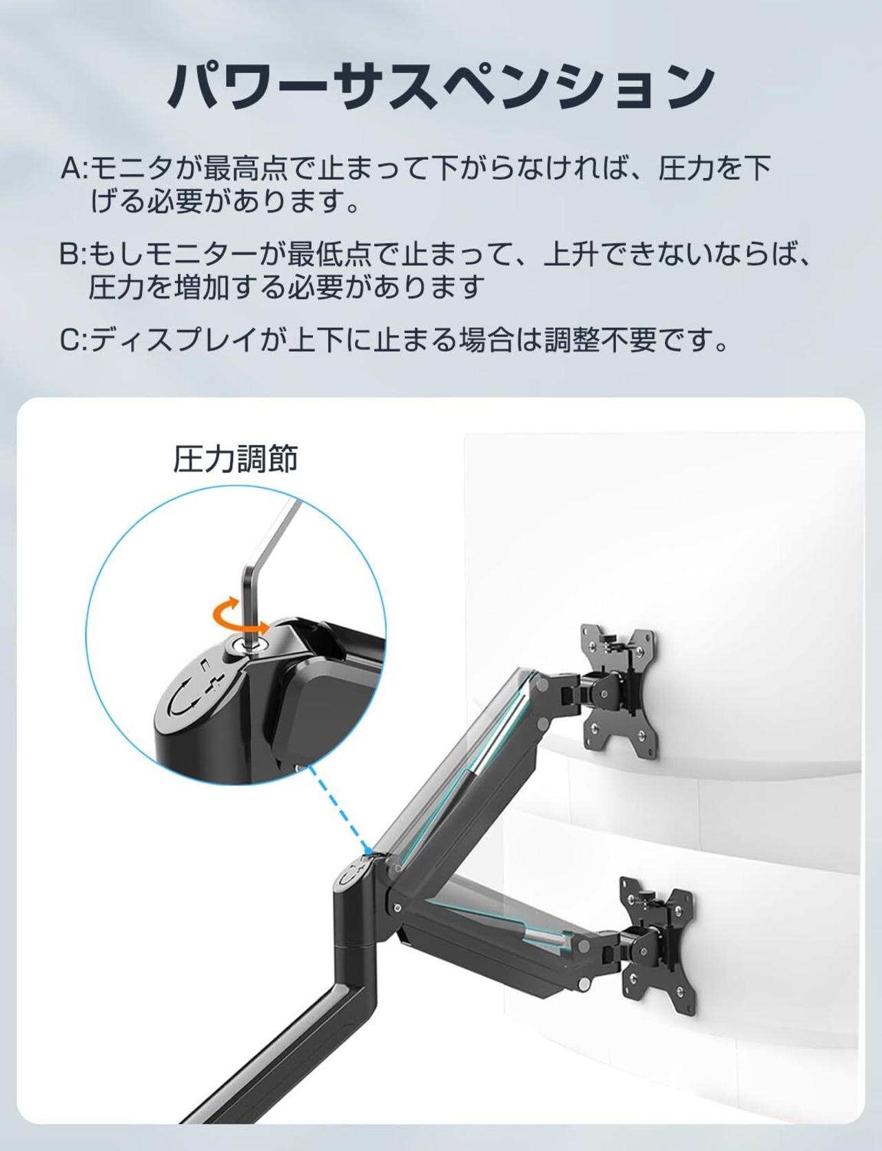 【より高い&角度調節】ほかのモニターアームに比べ、本品は従来のモニターアームに高さを加えています。他の製品の高さは425mmまでですが、本品は635mmまであり、身長180cm以上の方にもお使いいただけます。本品は接合部が360度回転することができ、片側0-538mm前後のストレッチが可能です。どんな姿勢でも液晶画面が見れて、目の疲れを軽減でき、作業効率が上がります。