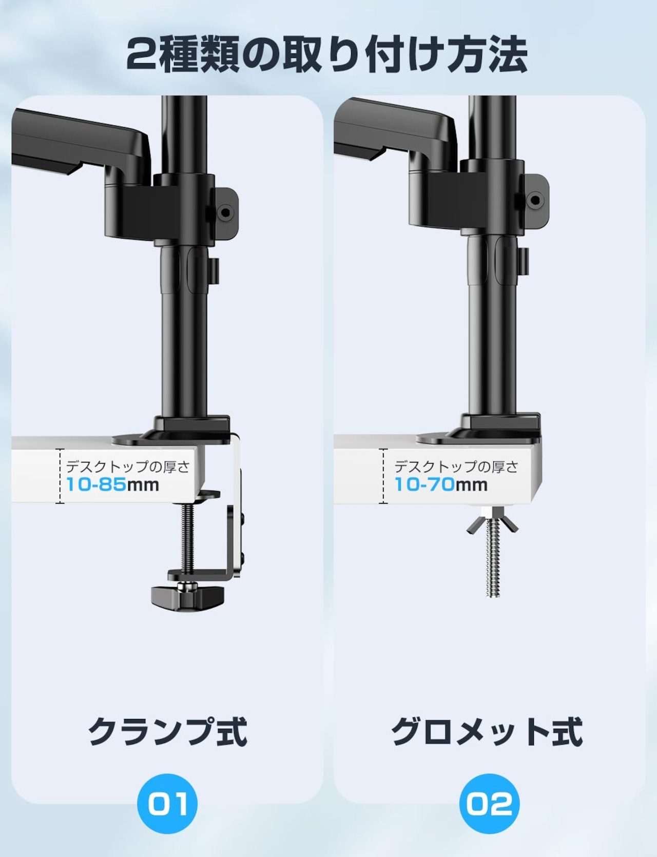 【デスク上のスペースをスッキリ】本製品は、取り付ける机に合わせてグロメットとクランプの2種類の取り付け方法があります。モニターの台座を必要としないので、モニタ下のスペースに書類やキーボードなどを収納でき、デスクの上を広く使うことができます。