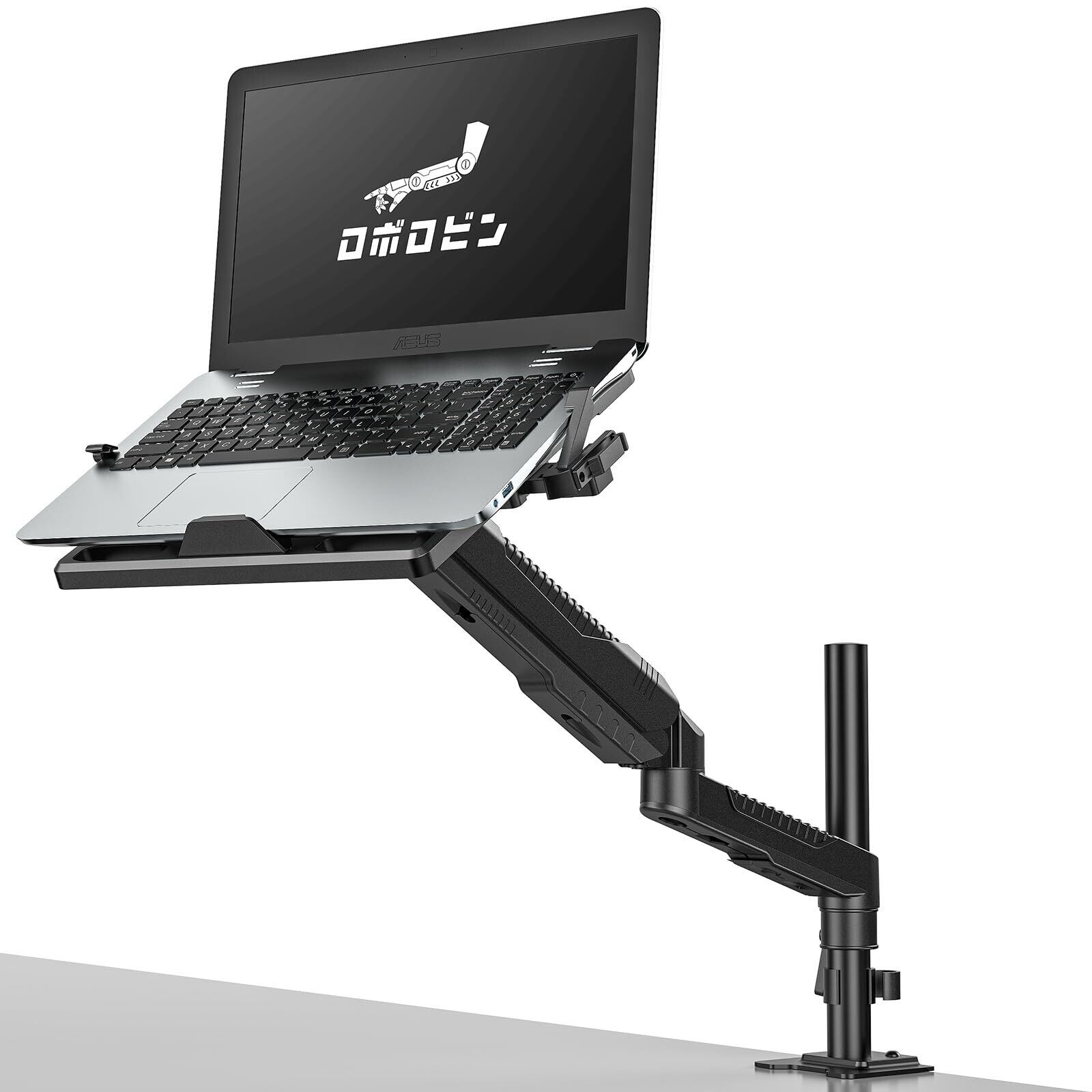 ロボロビン ノートパソコンアーム 安定性UPトレイ付き 11-17インチ対応 高さ12~60cm 多角度調整 ガススプリング式 広く可動域 グロメット式&クランプ式 モニターアーム 360度回転 15-27インチモニター対応 ノートPCスタンド アーム ディスプレイアーム ケーブル収納 耐荷重1~7KG VESA75*75/100*100