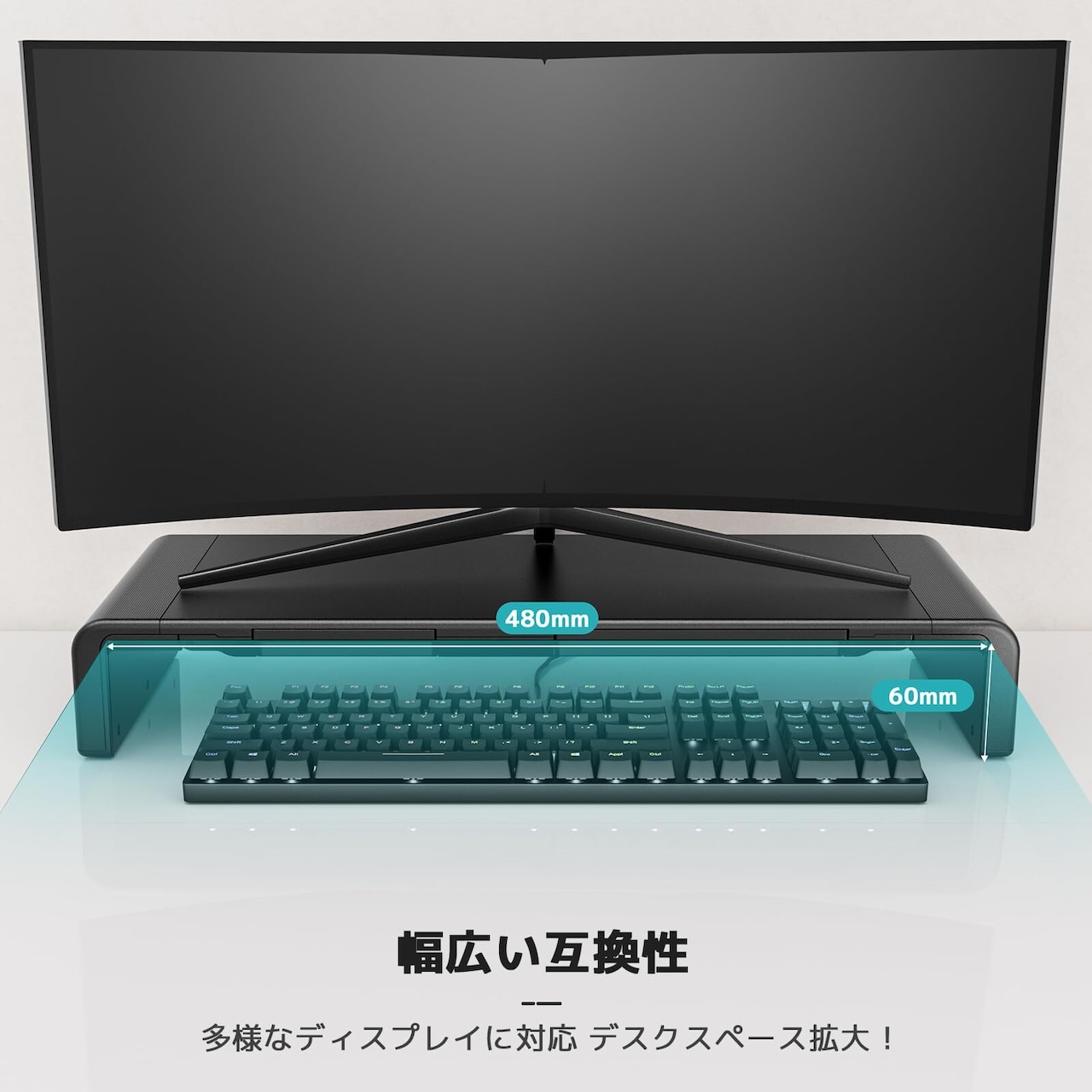 収納力抜群:モニター台の下にキーボードやマウスなどを収納できるスペースがあり、キーボードをホコリから防ぐことができ、デスクトップの作業スペースも広く取れます。引き出しやスマホホルダーも付いているので、オフィス用品を収納し、スマホやタブレットを置くことができます。