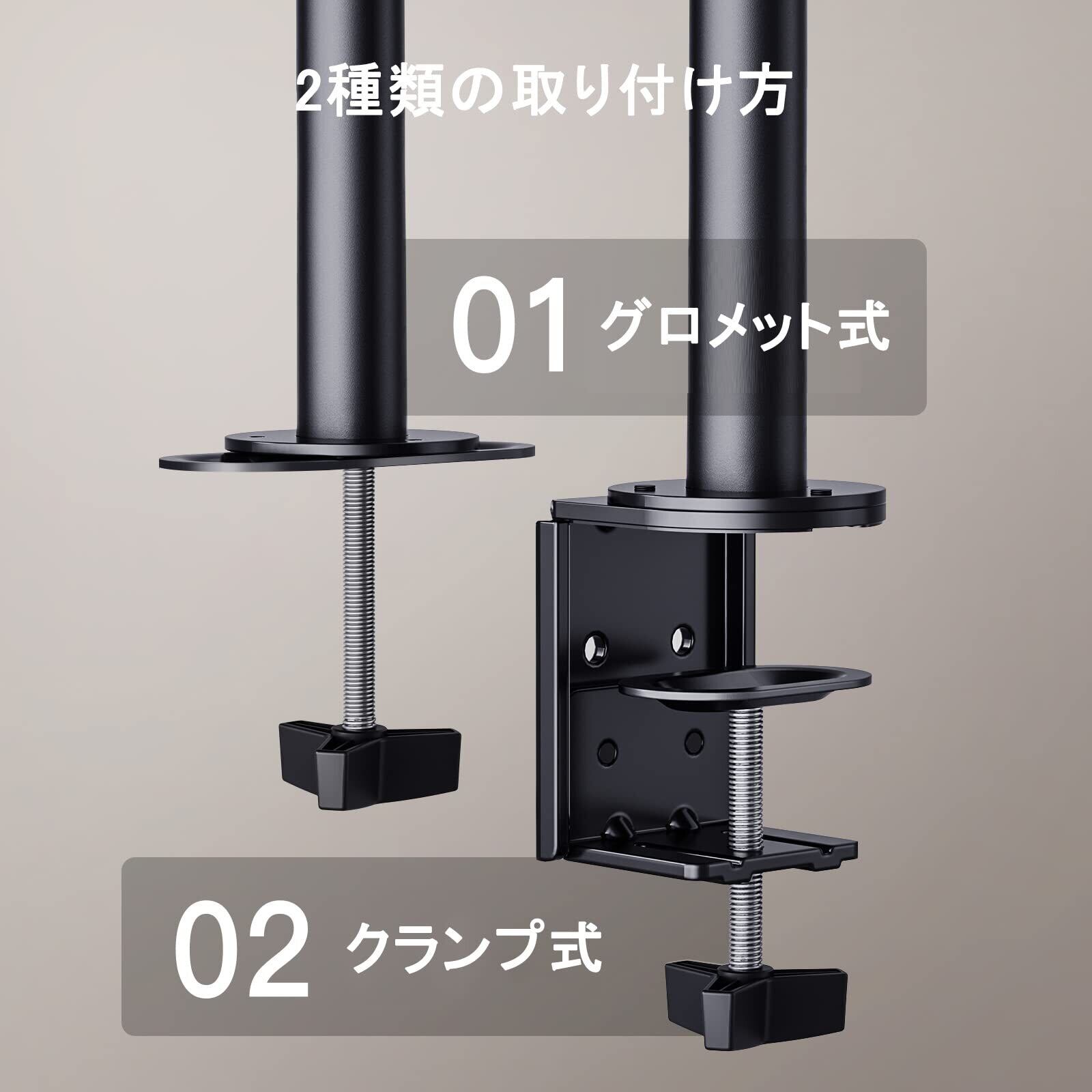 【2画面で作業スペースを拡大】片方の画面でネット検索、片方の画面で書類作成など、作業ごとにスペースを使い分けたい・操作に広い作業画面が欲しい方にデュアル型モニターアームお勧めいたします。それぞれのモニターの回転にも対応しており、片方の画面を縦画面、もう片方を横画面にするなど、幅広い環境を構築できます。