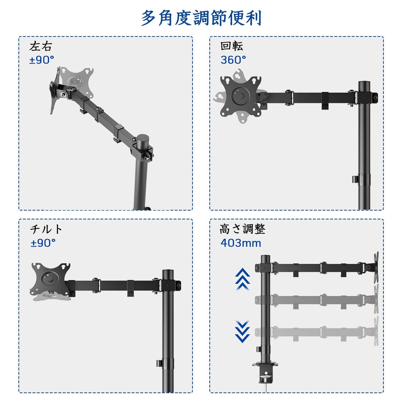 多角度調節:モニターは上向き90°、下向き90°、左右180°、回転360°に調節し、モニターアームは上下左右だけなく、前後にも動作し、画面との距離が調整可能です。モニターの縦横切り替えが簡単に行えます。