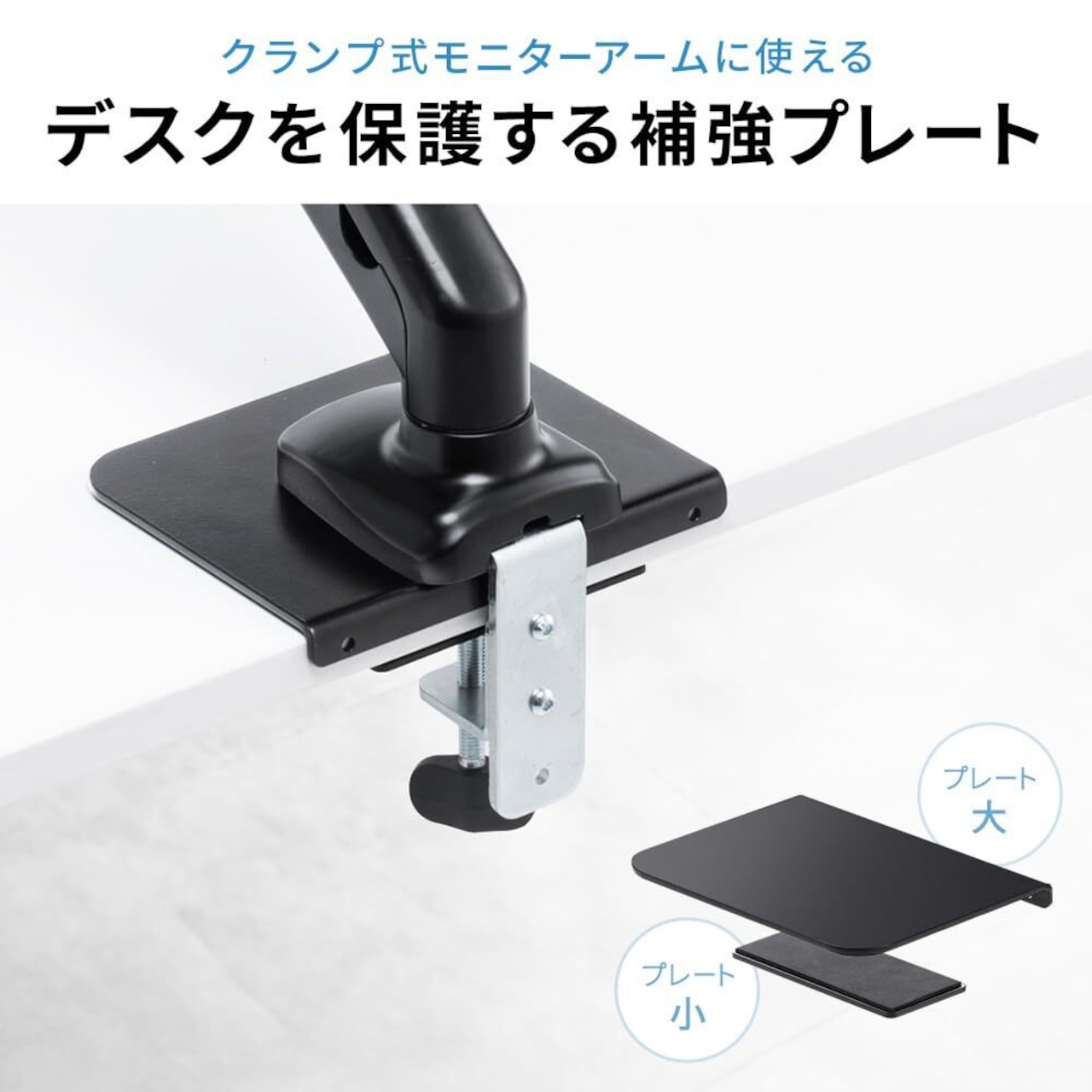 【デスクを保護する補強プレート】モニターアームのクランプ部分とデスク天板の間に挟んで使う、厚さ5mmの補強プレートです。本製品を使用することで、天板への接地面積が広がるので、アームの荷重を分散して、デスクの歪みを軽減します。