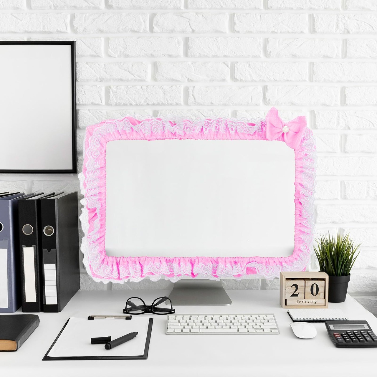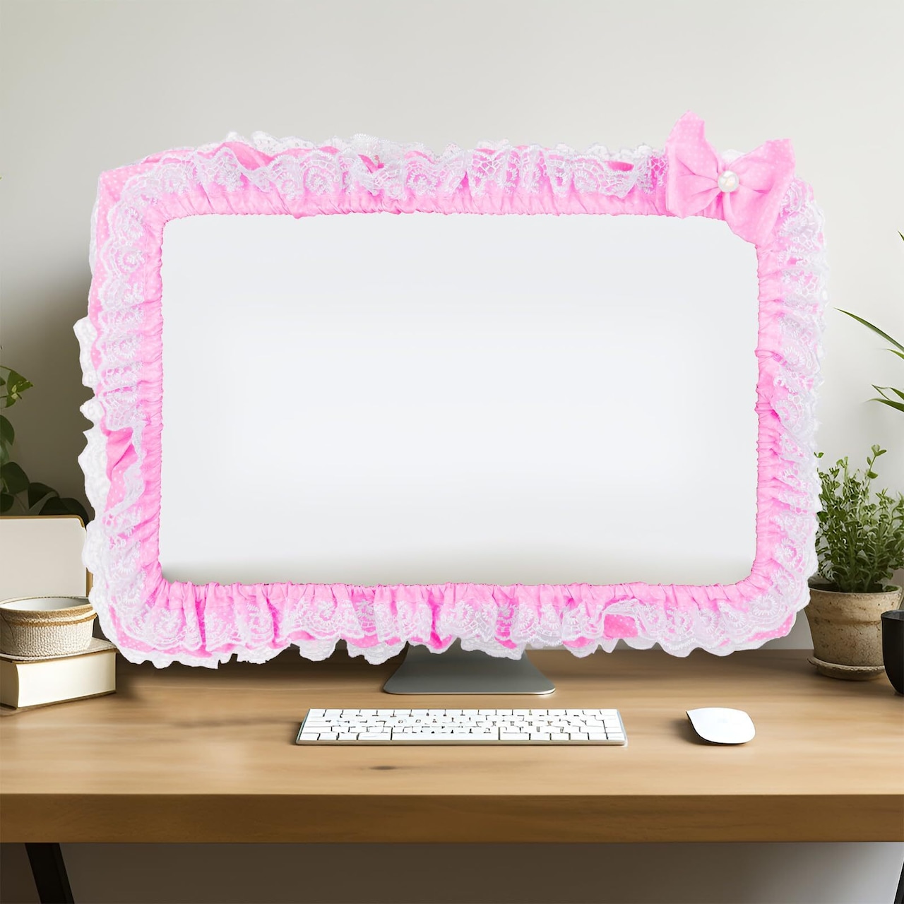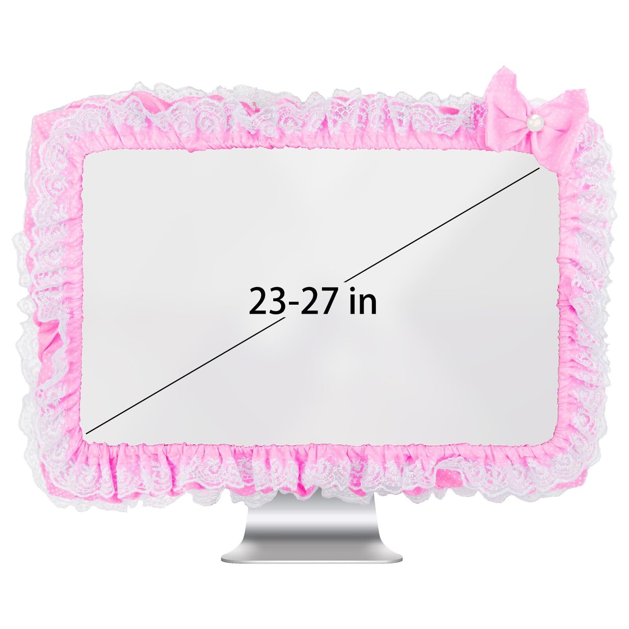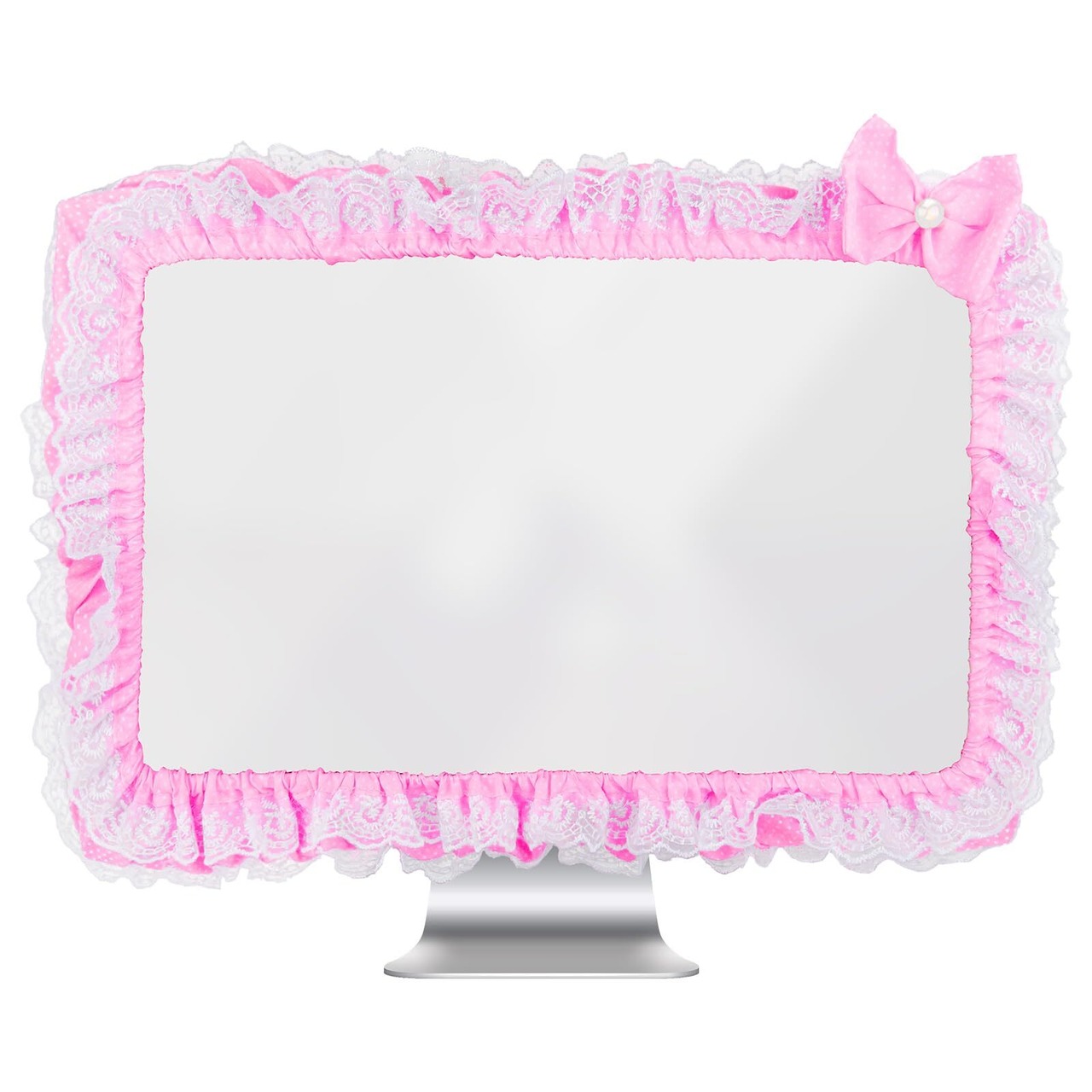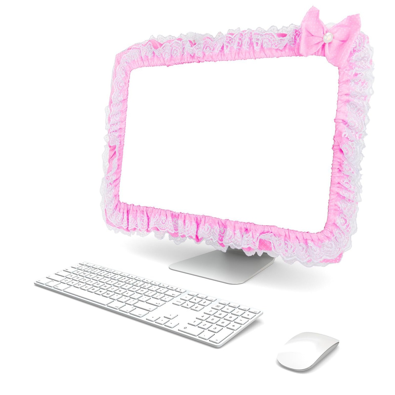 Kingshion 23インチ~27インチ 可愛いコンピューターモニターカバー かわいい伸縮性ペンポケット付き 蝶結び テレビ 液晶画面モニター 装飾 ダストカバープロテクター レース生地 ピンク