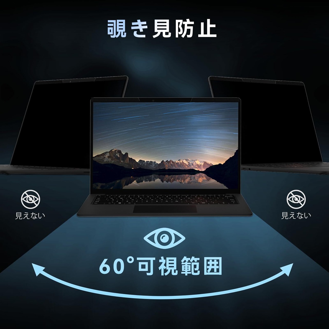 ◎覗き見防止:視野角は60度で、正面から見ると画面はクリアでも、隣の席からは真っ暗に映る偏光性を有する「のぞき見防止フィルター」です。新幹線・飛行機等による移動中でも、或いは、カフェやオフィスでも、周りからの視線を防ぎ、安心してパソコンを操作することが出来ます。