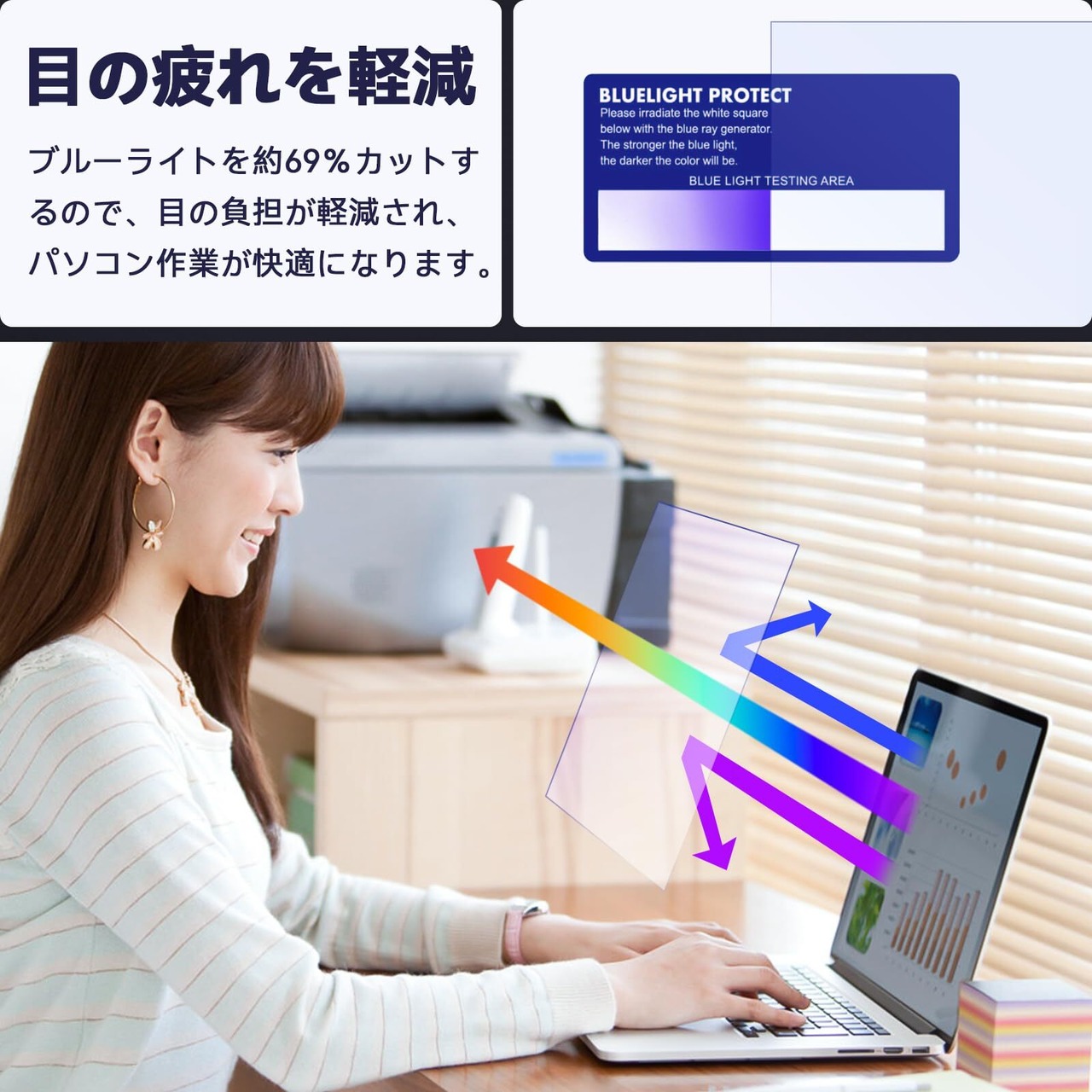【ブルーライトカット】:ブルーライトをあび過ぎると、眼精疲労を誘発し、体内リズムの乱れを引き起こす場合があると言われております。 本製品ではブルーライトを約69%低減できます。また、紫外線のカット率は99%です。目の負担を軽減するため、長時間の作業に最適です。
