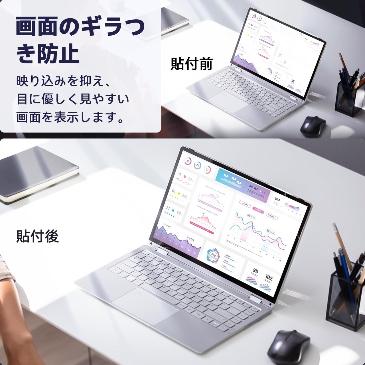 【指紋防止&抗菌性】:指紋や汚れが付きにくく、付いても簡単に拭き取ることができます。ホコリが付着しにくい帯電防止仕様です。タッチパネルにも対応しています。フィルム表面が抗菌処理されており、細菌の繁殖を防ぎます。