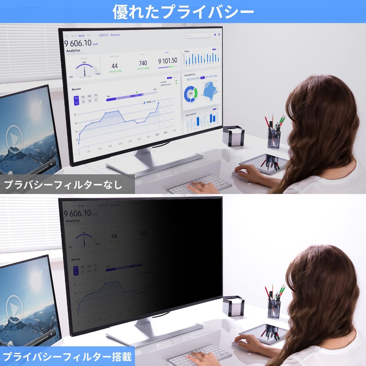 【目の保護&傷防止機能】 この24インチコンピュータープライバシーフィルターは、95%の眩しさ、98%のブルーライト、99%の紫外線をカットし、目の疲れを軽減します。さらに、強化された保護層により、高解像度の画質が保たれ、スクリーンへの傷も防げます。
