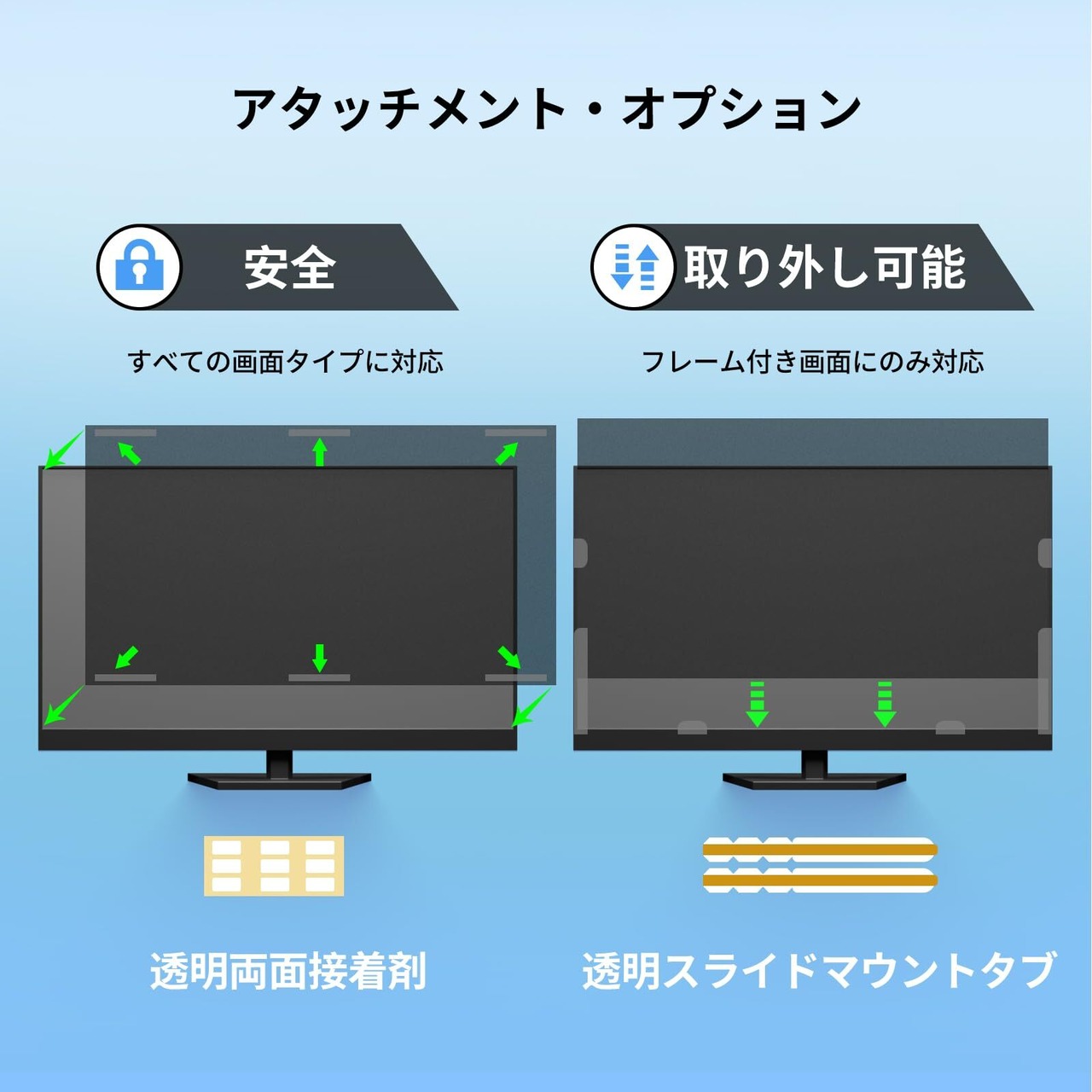 【2種類の取り付け方法】 簡単に取り付けが可能です。 ① 永久的な取り付け - 両面テープを使用し、16:9アスペクト比の24インチモニターに適合します。 ② 着脱可能な取り付け - 上昇フレームのあるモニターに対応するスライド式取り付けタブ。 防窥膜のマットな表面はブルーライトや眩しさを抑制し、光沢のある表面は優れたプライバシー保護を提供します。用途に応じて選択可能です。