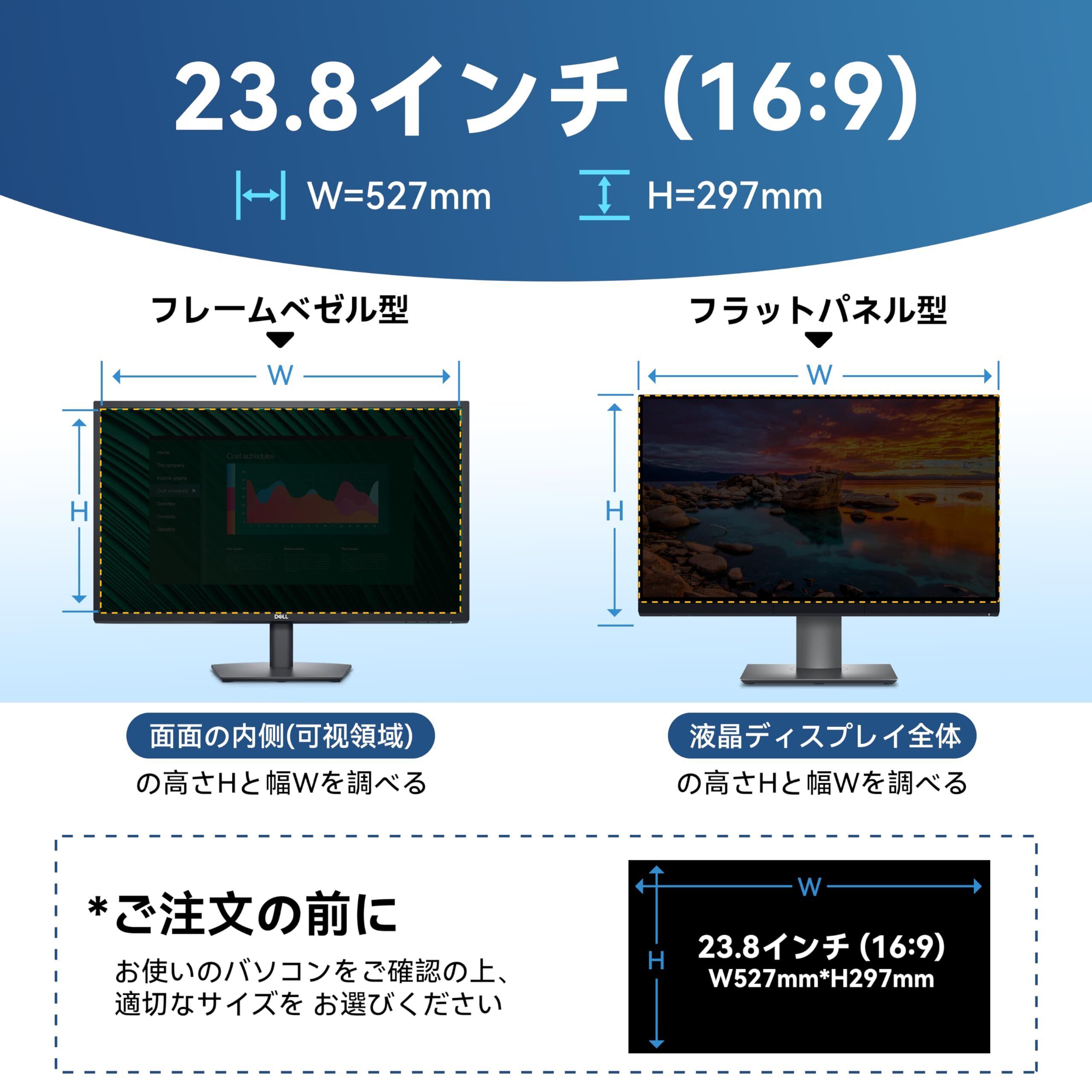 【フィルターサイズ 】: 16:9 23.8インチ(528×297㎜)の液晶モニター/ディスプレイ 。※湾曲型モニターには使用できません。 iiyama XB2481HSU IODATA LCD-AH241EDB Dell P2419HC HP M24f M24fw X24ih/ SE2416H S2431HS S2421H/ EIZO FLexScan EV2480-BK/ IODATA DIOS-LDH241DB/ LG UltraGear 24GN650 24QP500-B 24GN600-B/ MSI PRO MP242 など 23.8型 縦横比16:9。ご注文前に、画面の幅と高さの寸法をご確認ください。画面の対角線サイズのみに基づいて選択することはお勧めしません