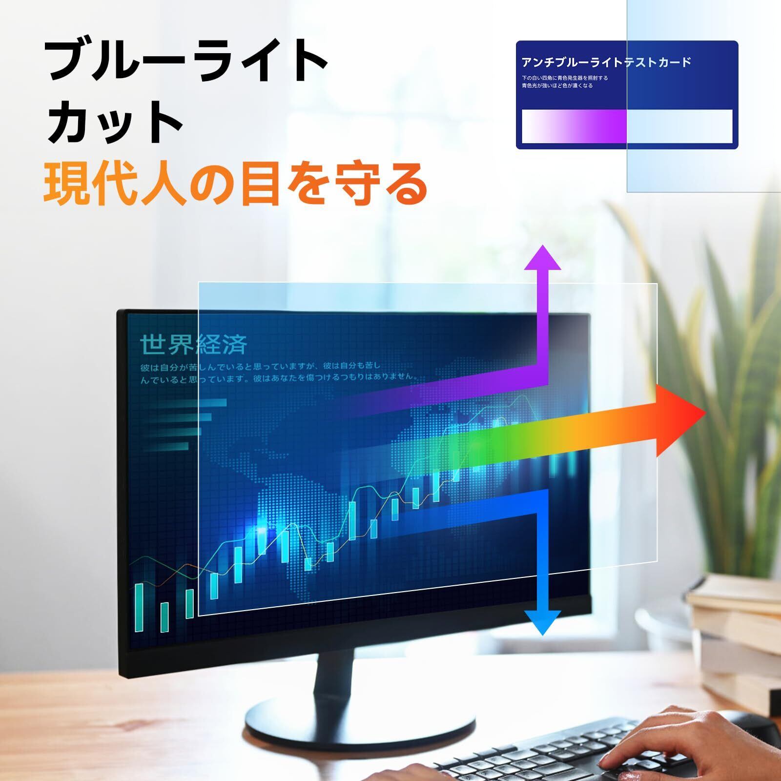 【ブルーライトカット】:ブルーライトをあび過ぎると、眼精疲労を誘発し、体内リズムの乱れを引き起こす場合があると言われております。 本製品ではブルーライトを約69%低減できます。また、紫外線のカット率は99%です。目の負担を軽減するため、長時間の作業に最適です。