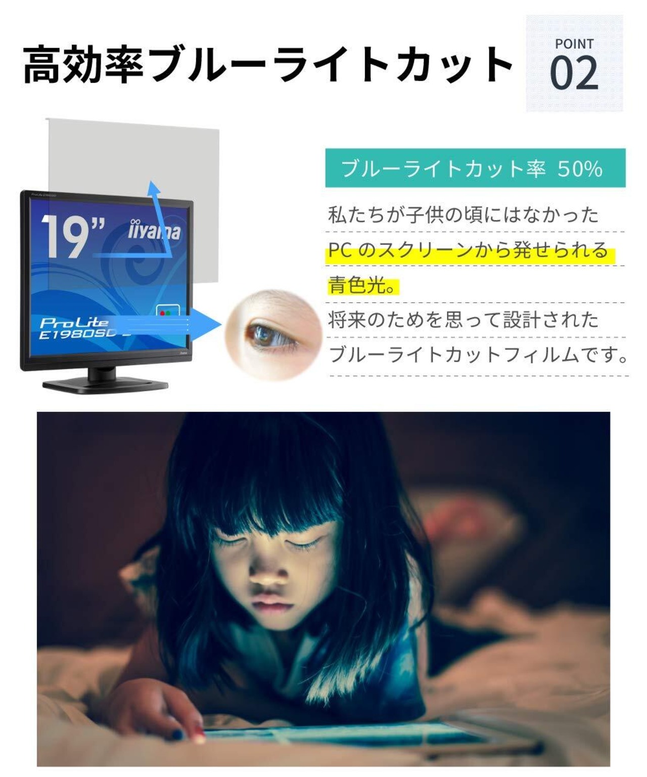 【ブルーライトカット】 私たちが子供の頃にはなかった液晶モニター。だから、毒性の強いブルーライトを50%低減しました。ゲームをしたりお子様の将来のことを考えるなら、ブルーライトカット対応フィルムがオススメです。