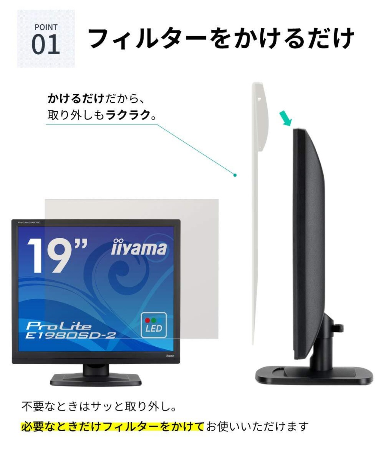 【置くだけ簡単設置】 モニターに本フィルターを引っ掛けるだけで簡単に設置ができます。 大切なスクリーンを、外部の衝撃から守る丈夫なアクリル製の保護パネル。モニターを買い替えた場合でもサイズが同じであれば半永久的に利用が可能。 貼り付けタイプのフィルムと異なり、必要な時に必要な時間だけお使いいただくことができます。※フィルターの上部には2つの穴が空いています。紐や針金を使ってモニターにフィルターを固定することができます。地震や災害などもしもに備え、フィルターの脱落防止用としてご利用いただけます。
