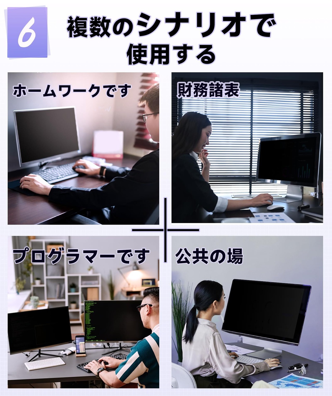 【取り付け簡単】 pc のぞき見防止フィルター 24インチには2つの独自に設計された取り付け方法があります:①永久取り付け:両面テープ。すべてのコンピュータで動作します。 ②取り外し可能な取り付けとスナップイン取り付け。盛り上がったベゼルを備えたコンピューター用。最適な方法を選択すると、覗き見防止フィルムパソコンを 20 秒でコンピュータ画面に完璧にフィットさせることができます。