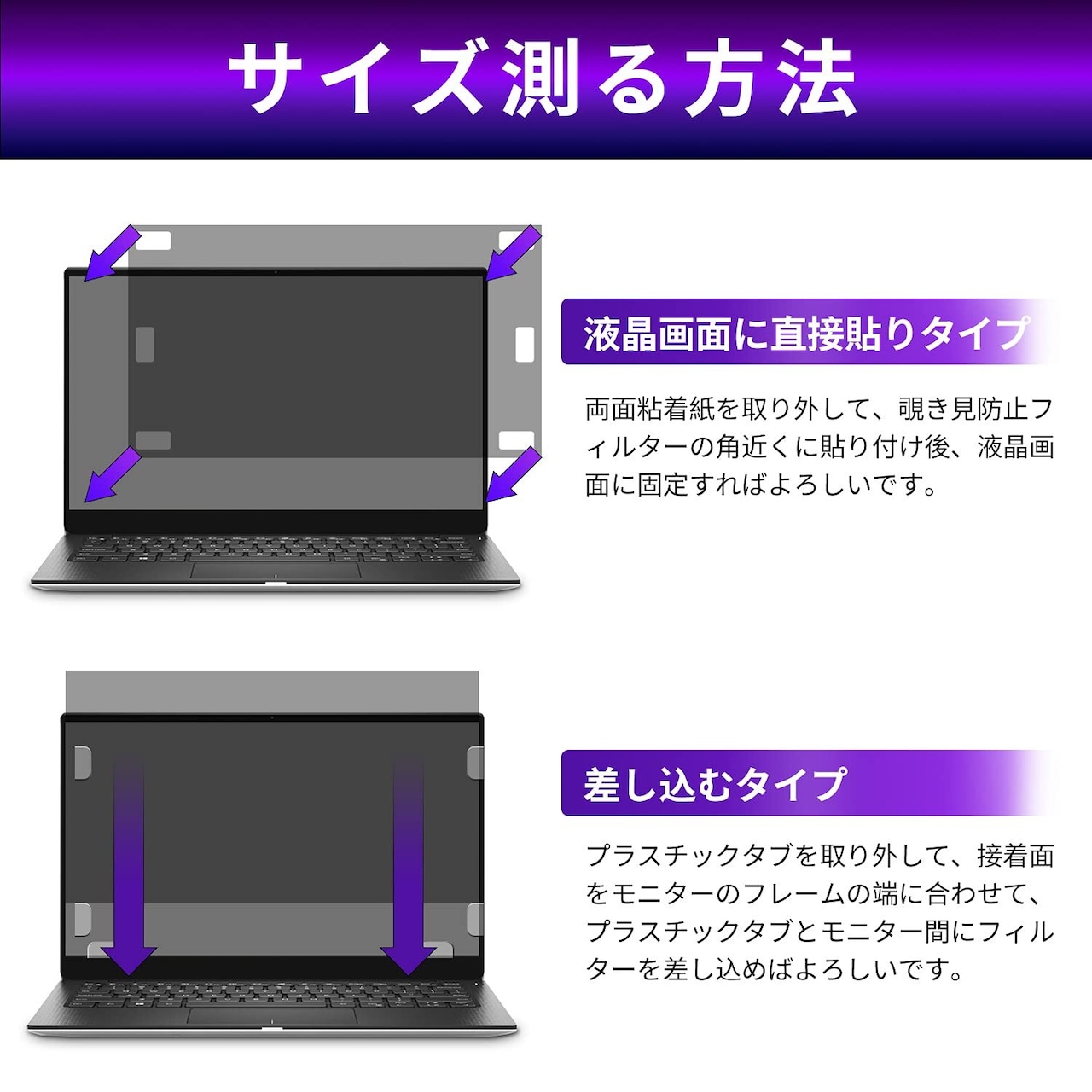 【インストール簡単】2種インストール方法があります。スライド式のタブタイプと画面に直接貼る固定タイプです。【包装内容】覗き見防止フィルター*1、インストール説明書、クロス、両面粘着紙(固定するタイプ)、プラスチックタブ(スライドタイプー)。注:タッチパネルには対応しておりませんので、ご了承ください。