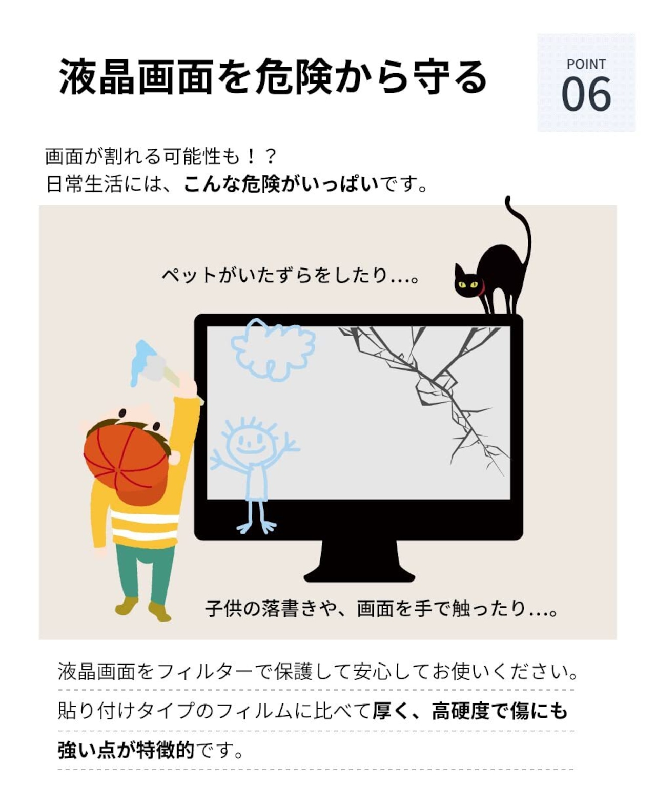 【高硬度】 子供の手垢でいっぱいになったり、落書きをされたり、おもちゃをぶつけられたり、ペットがイタズラをしそうになった経験はありませんか? 本フィルターは厚さ2mmで表面硬度9Hと強靭。 スクラッチ(傷)や、衝撃にも強く、モニターを使用しないときでもフィルターをかけているだけで安心です。