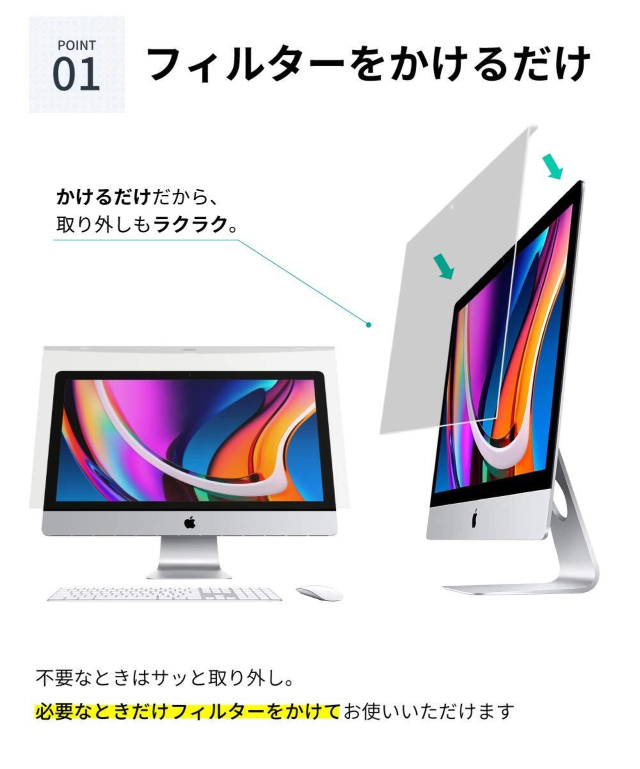 【置くだけ簡単設置】 モニターに本フィルターを引っ掛けるだけで簡単に設置ができます。 大切なスクリーンを、外部の衝撃から守る丈夫なアクリル製の保護パネル。モニターを買い替えた場合でもサイズが同じであれば半永久的に利用が可能。 貼り付けタイプのフィルムと異なり、必要な時に必要な時間だけお使いいただくことができます。