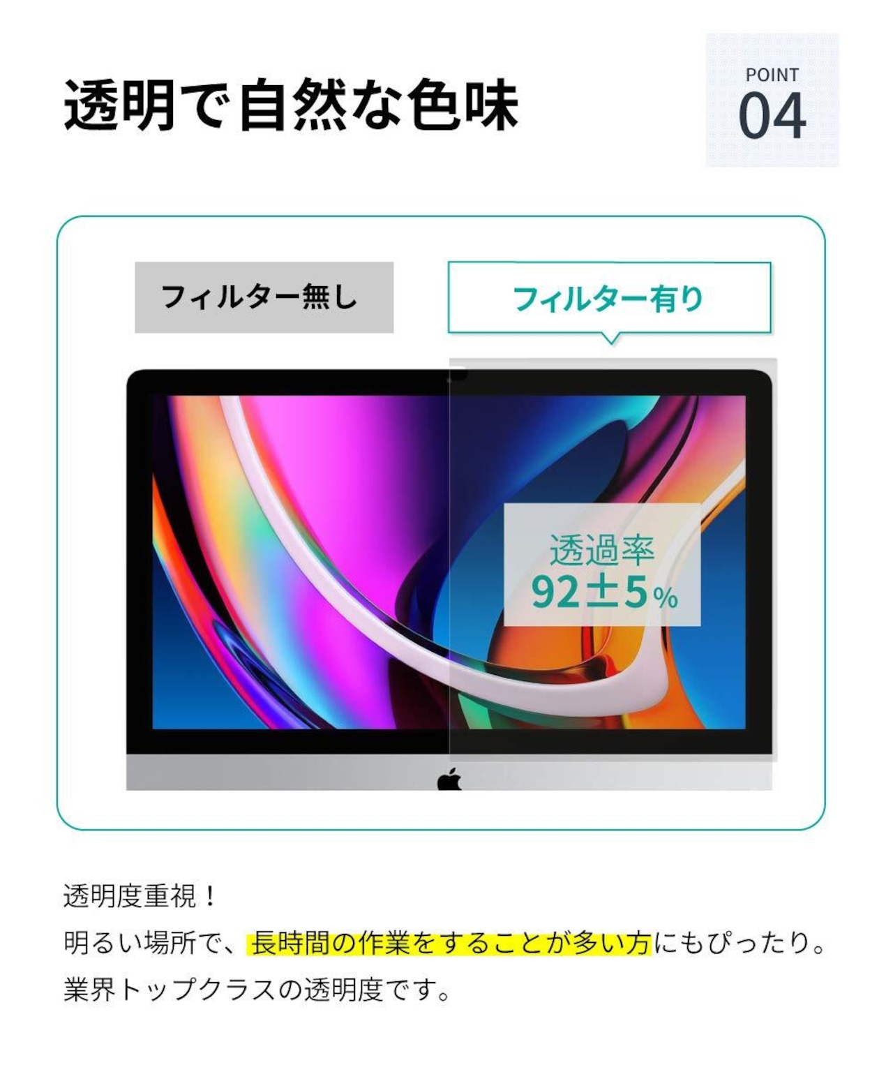 【高い透明度】 透過率92%、UVカット率99%と見やすさの点で業界トップクラスのグレアフィルター。 ブルーライトカット性能を保持しつつ、フィルター自体の色味を抑えた素材でエクセルやワードなど、