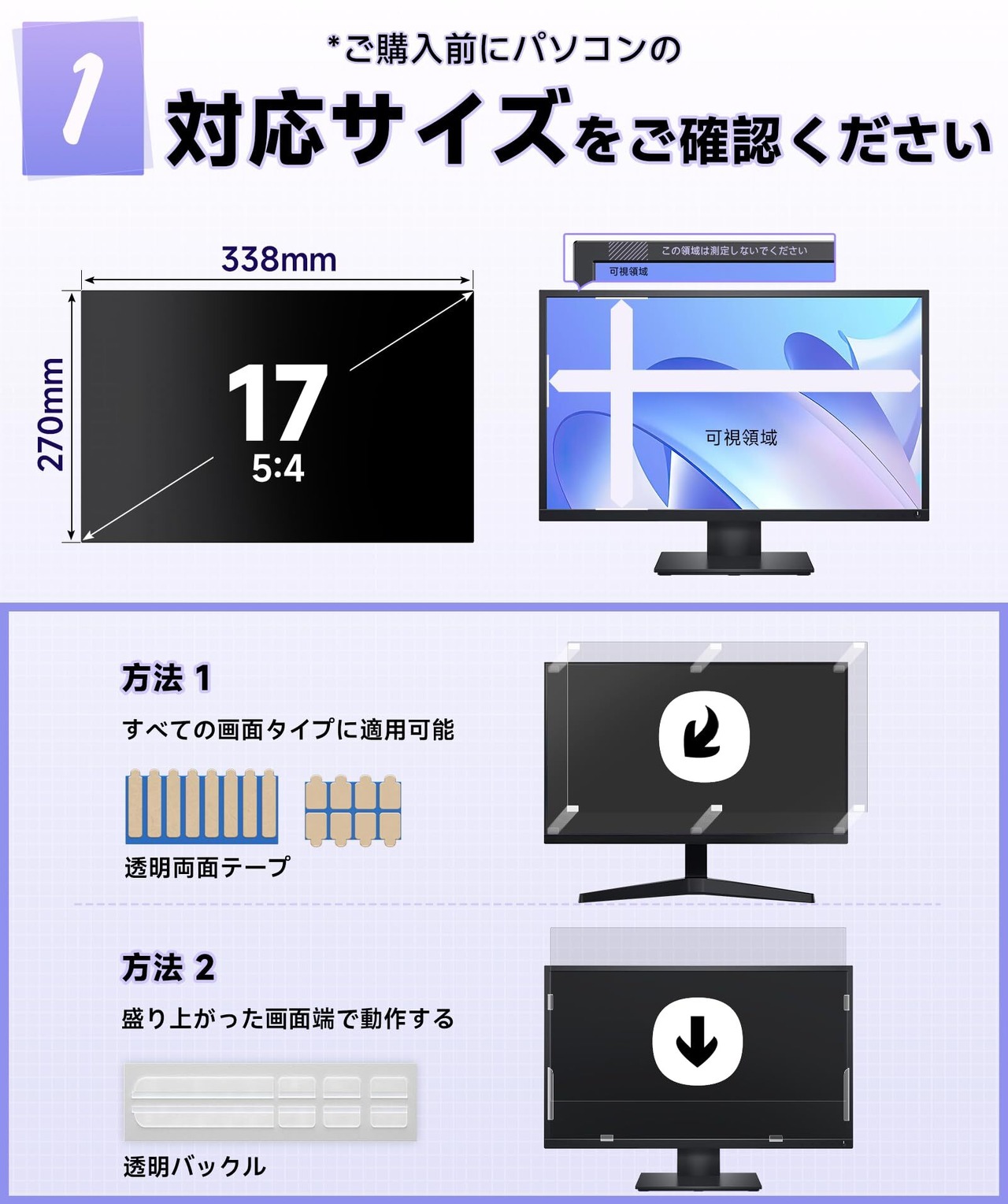 【取り付け簡単】 pc のぞき見防止フィルター 17インチには2つの独自に設計された取り付け方法があります:①永久取り付け:両面テープ。すべてのコンピュータで動作します。 ②取り外し可能な取り付けとスナップイン取り付け。盛り上がったベゼルを備えたコンピューター用。最適な方法を選択すると、覗き見防止フィルムパソコンを 20 秒でコンピュータ画面に完璧にフィットさせることができます。