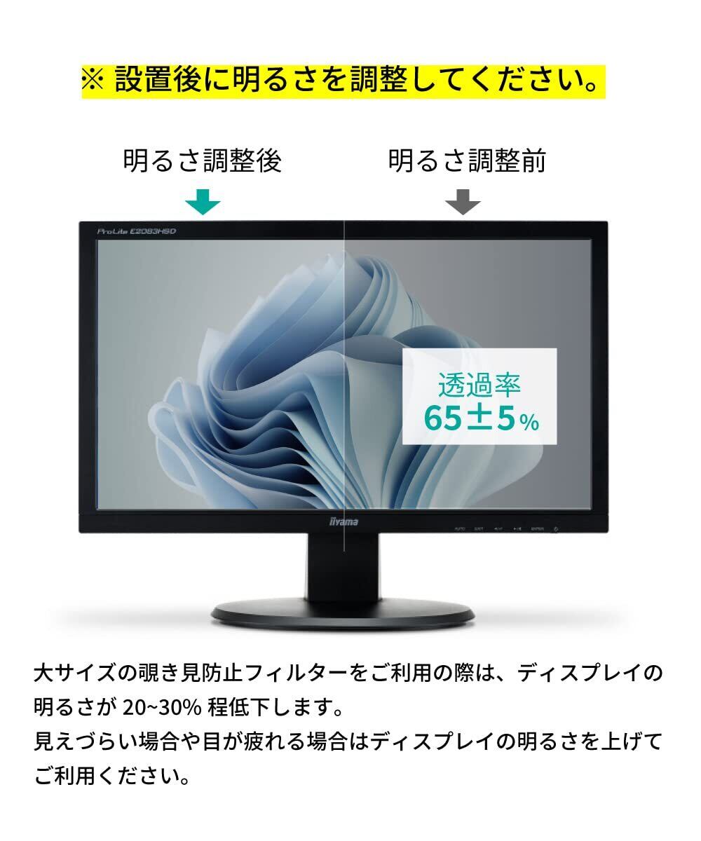 [ 装着方法 ] <直張り方式> お使いのPCモニターに両面シールを貼り付けてフィルターを貼るだけ簡単ですぐにご利用いただけます。 ※ご利用のPCモニターの種類によっては可視領域より数ミリ小さい場合がございます。ご注文前に画像2枚目でフィルターサイズをご確認ください。