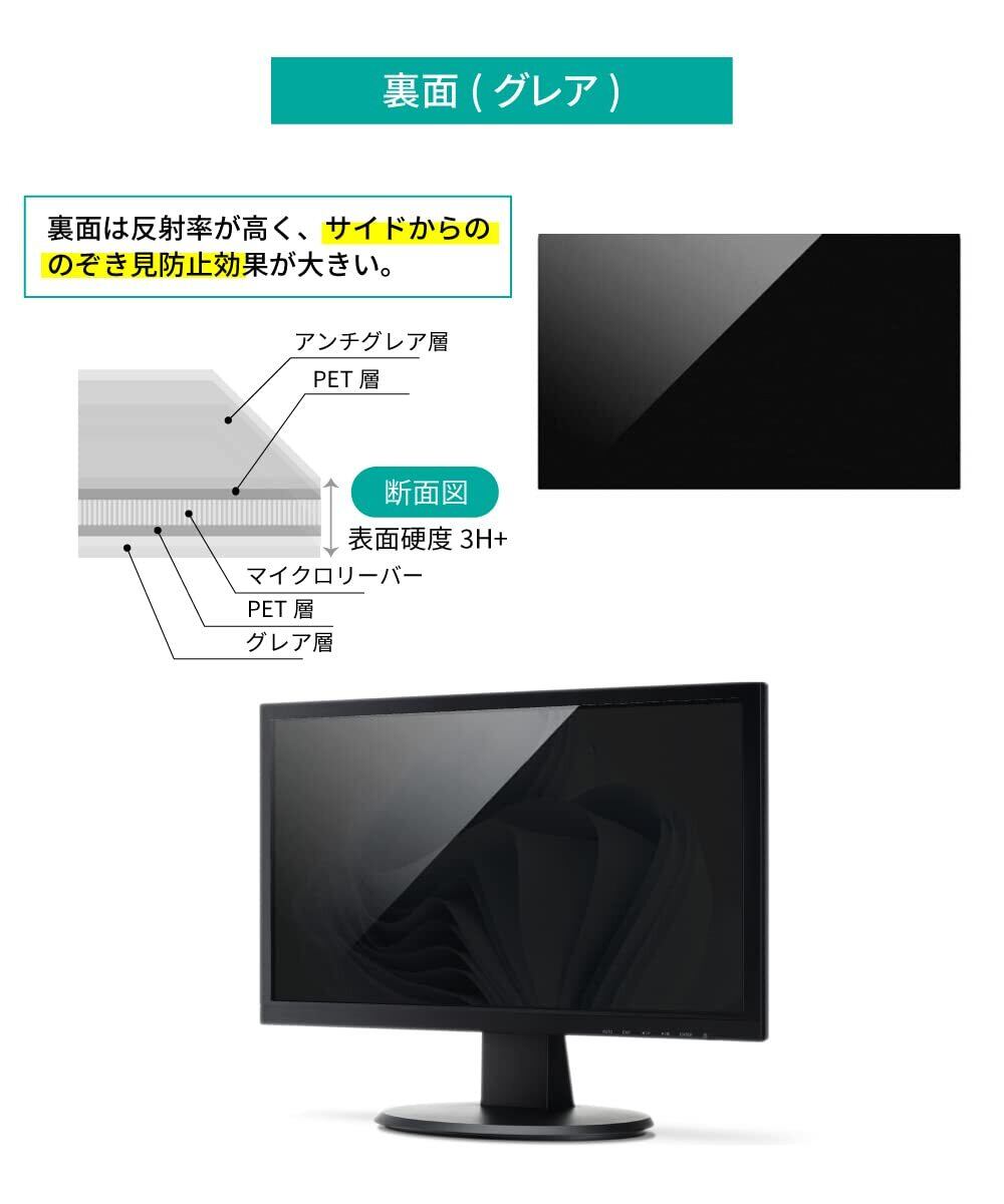[ リバーシブル ] 表面はマットな質感で反射が少なく蛍光灯の多い場所でも見やすいアンチグレア面(反射防止加工・非光沢)、 裏面は反射率が高くサイドからの覗き見防止効果が大きいグレア面(光沢)です。ご利用環境に合わせて覗き見防止フィルターをご利用いただくことができます。