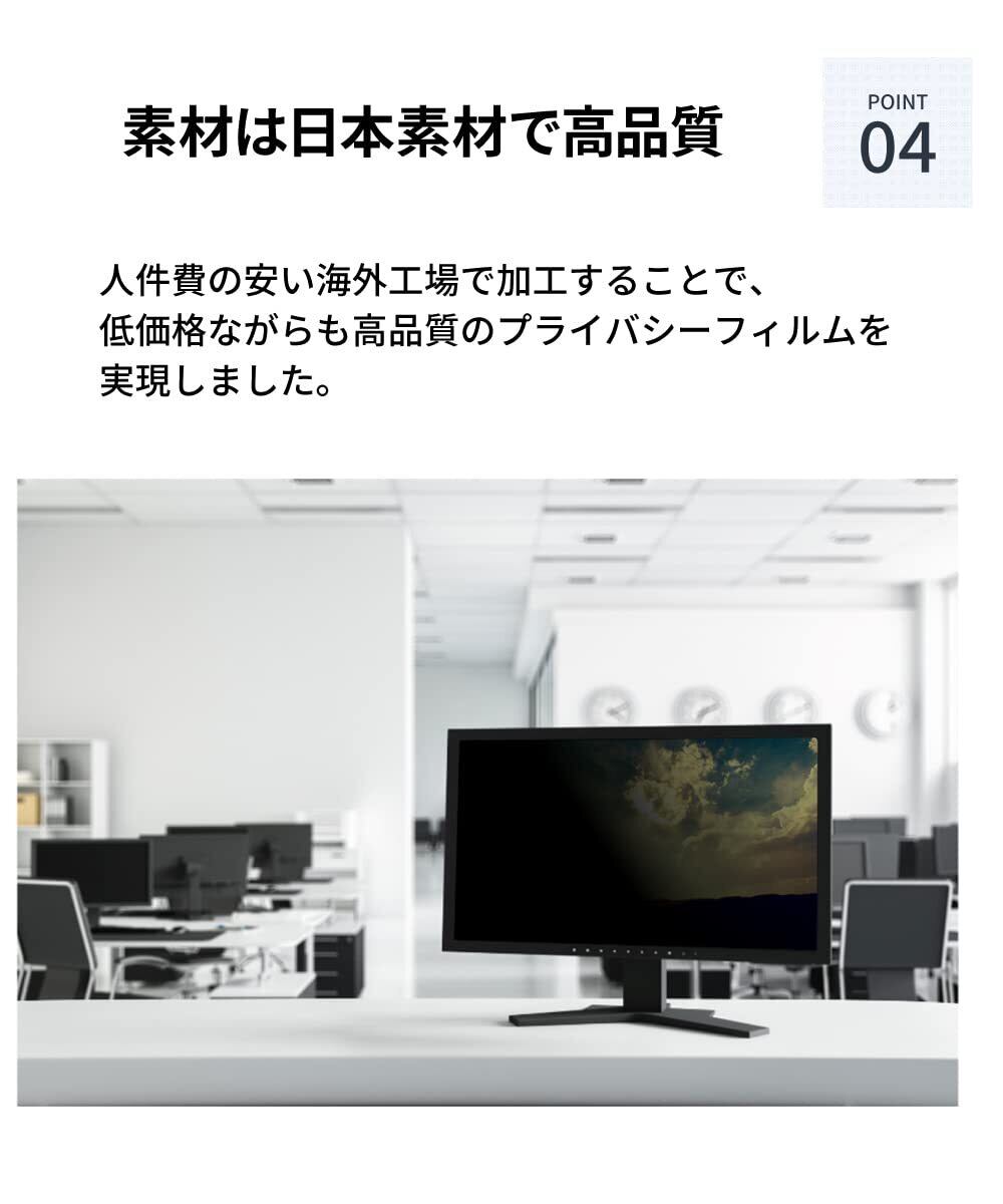 [ ブルーライトカット ] 私たちが子供の頃にはなかったPCモニターのスクリーンから発せられる青色光。 毒性の強いブルーライトは眼精疲労や体内リズムへの影響が益々懸念されています。 本製品は覗見防止効果を有しながら、ブルーライトを約50%低減。将来のことを考えるならブルーライトカット対応 パソコン 覗き見防止 フィルム がオススメです。AG面は反射率5.8%とアンチグレアで光の映り込みもほとんどありません。