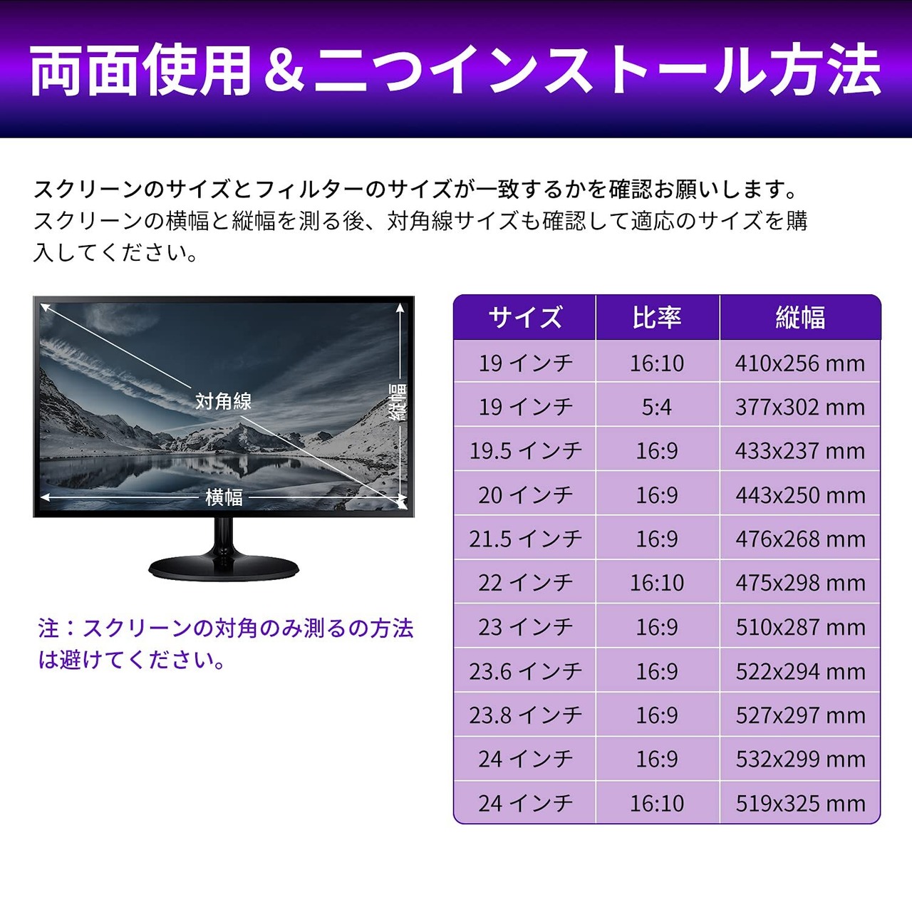 【多機能プライバシーフィルター】アスクリーンコーティングは目の疲れを軽減し、ブルーライト49%カット、紫外線99%カット、目の疲れを減少して快適に視聴や作業を楽しめます。【反射防止】両面使用可能フィルターなのでマット面と光沢面があります。マット面は反射防止加工施し、映り込みを防ぎます。光沢面の高透過率を実現します。