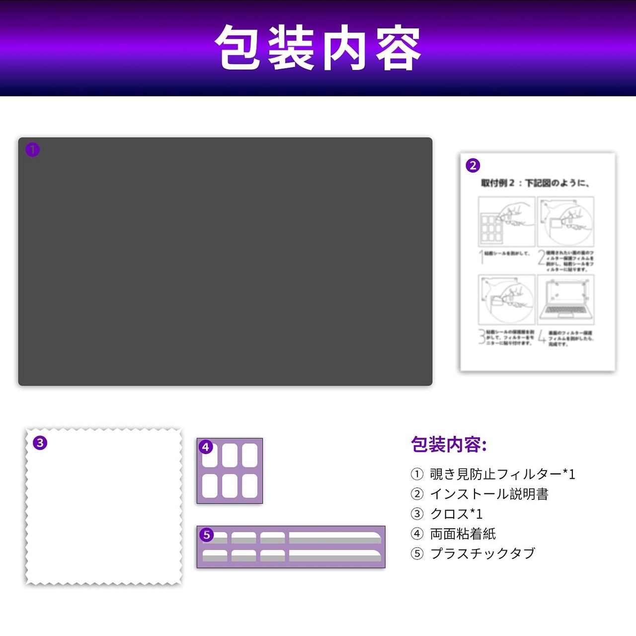 【インストール簡単】2種インストール方法があります。スライド式のタブタイプと画面に直接貼る固定タイプです。【包装内容】覗き見防止フィルター*1、インストール説明書、クロス、両面粘着紙(固定するタイプ)、プラスチックタブ(スライドタイプー)。注:タッチパネルには対応しておりませんので、ご了承ください。