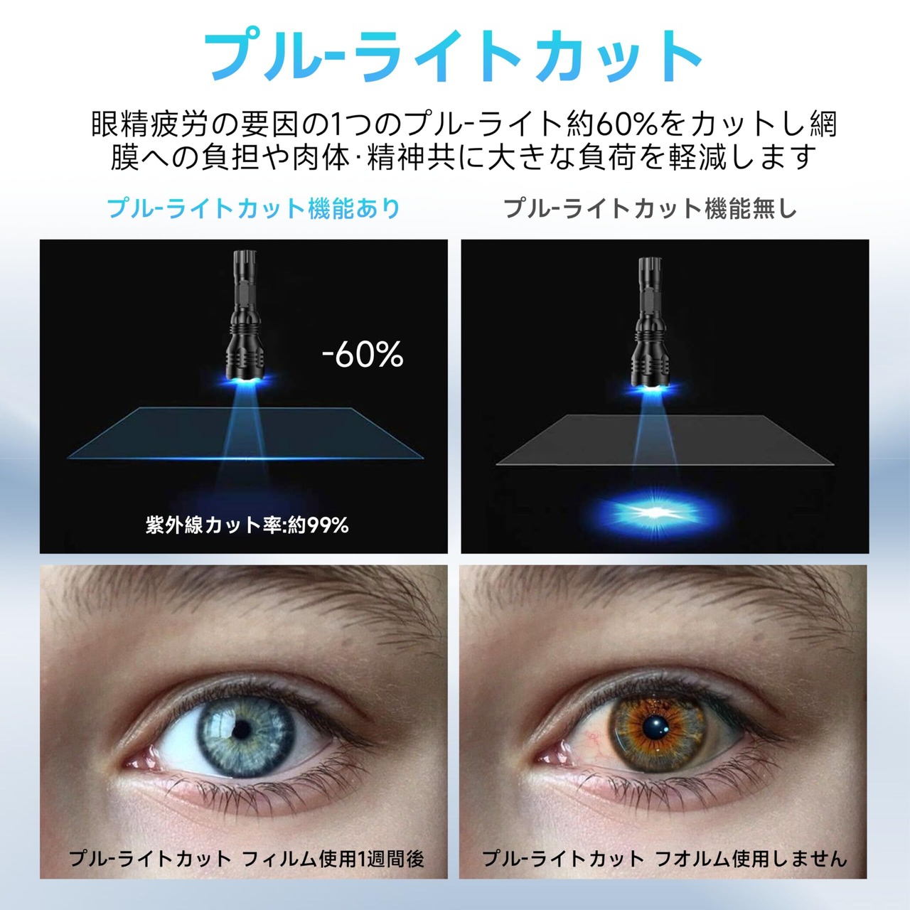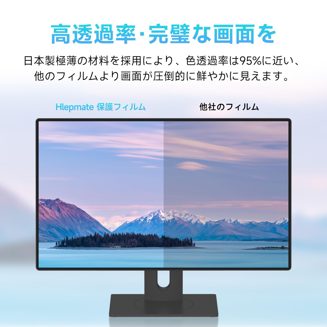 【ブルーライトカットフィルム】お客様の目を保護したく、見やすさも重視されたため、透過率とブルーライト性能のバランスに優れたPET材料を採用して作られたブルーライトカットフィルムです。フィルムのブルーライトカット率は69.7%に達し、紫外線カート率さらに99%に達します。高透過性でフィルムなしの画面の鮮やかを再現でき、目に優しいパソコン 液晶 保護フィルムです。