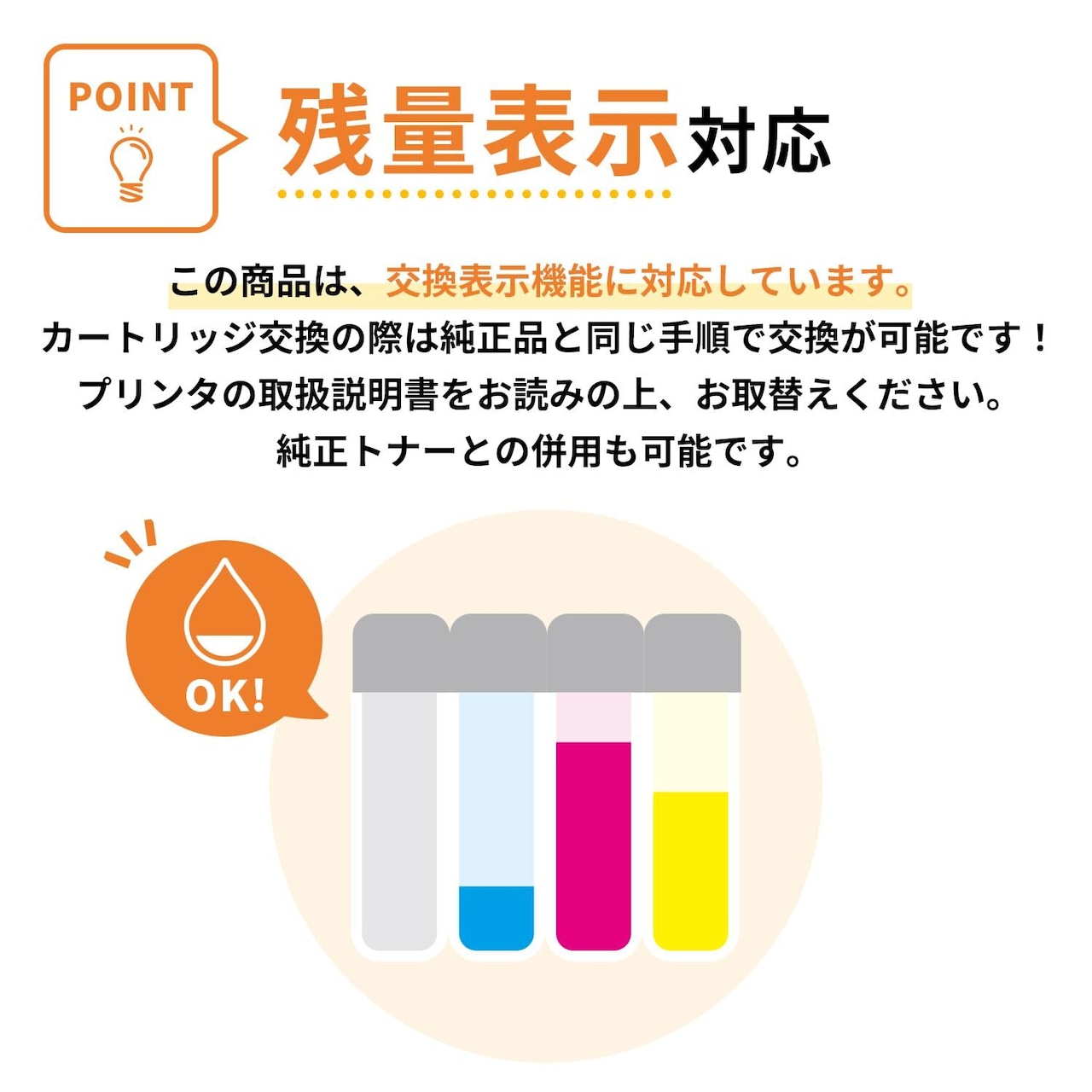 [商品説明] ・本製品は純正品と同様にご利用いただける互換トナーカートリッジです。メーカー純正品ではございません。 ・純正品と同様、カートリッジの両サイドについているギアにて認識・残量管理が可能です。 ・※トナーのギアがプリンターギアとかみ合って認識される仕様ですので、カートリッジを装着する際は、きっちりと奥まではめ込んでください。 ・カラ打ち防止のため、トナーパウダーは多めに入っており、使用後も若干残りますが異常ではありません。