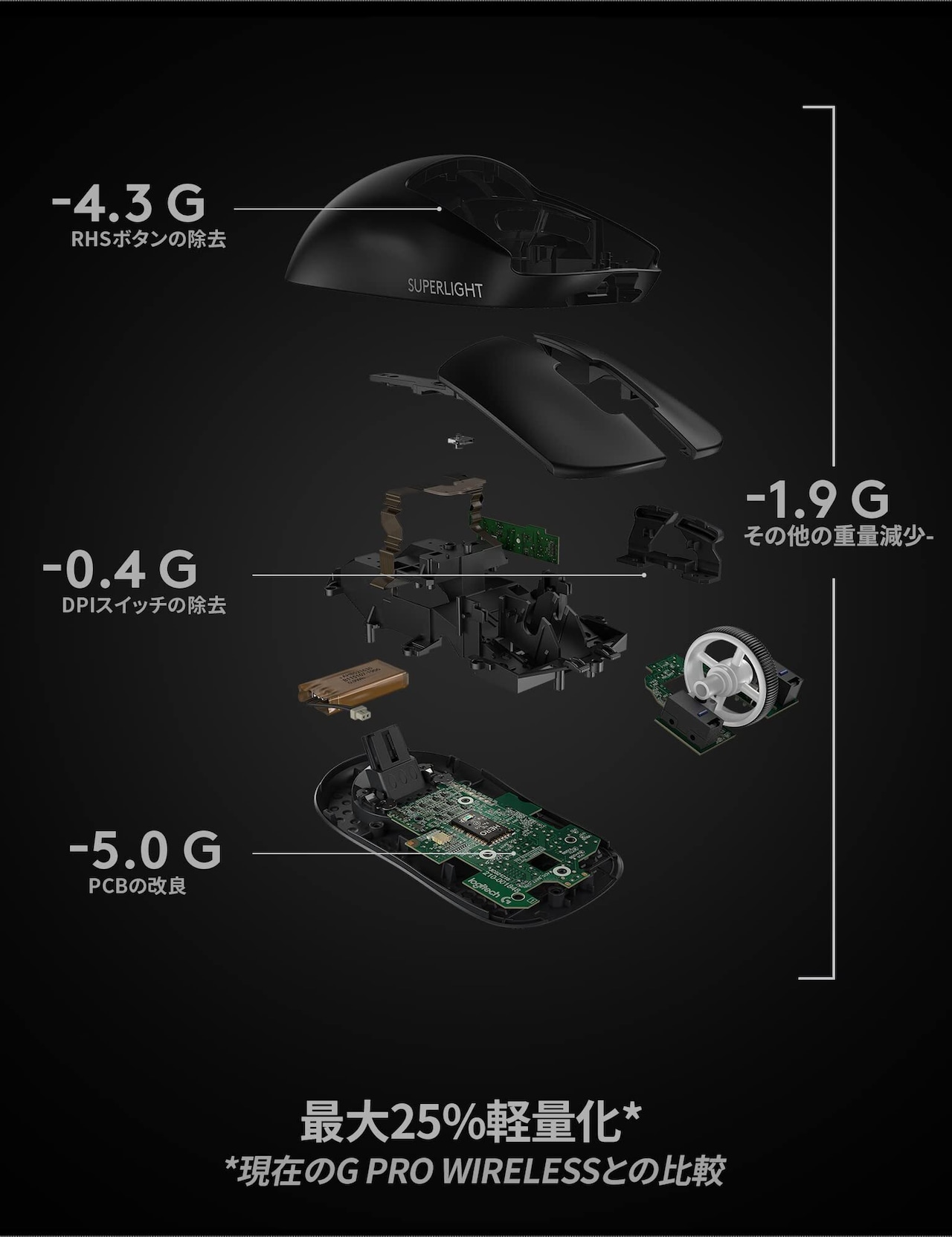 【ロジクールG史上最軽量のワイヤレスゲーミングマウス】驚きの63g未満の超軽量、GPROゲーミングマウス(80g)より更に25%軽量化され、新しいGPROは PRO X SUPERLIGHTの名を冠した。