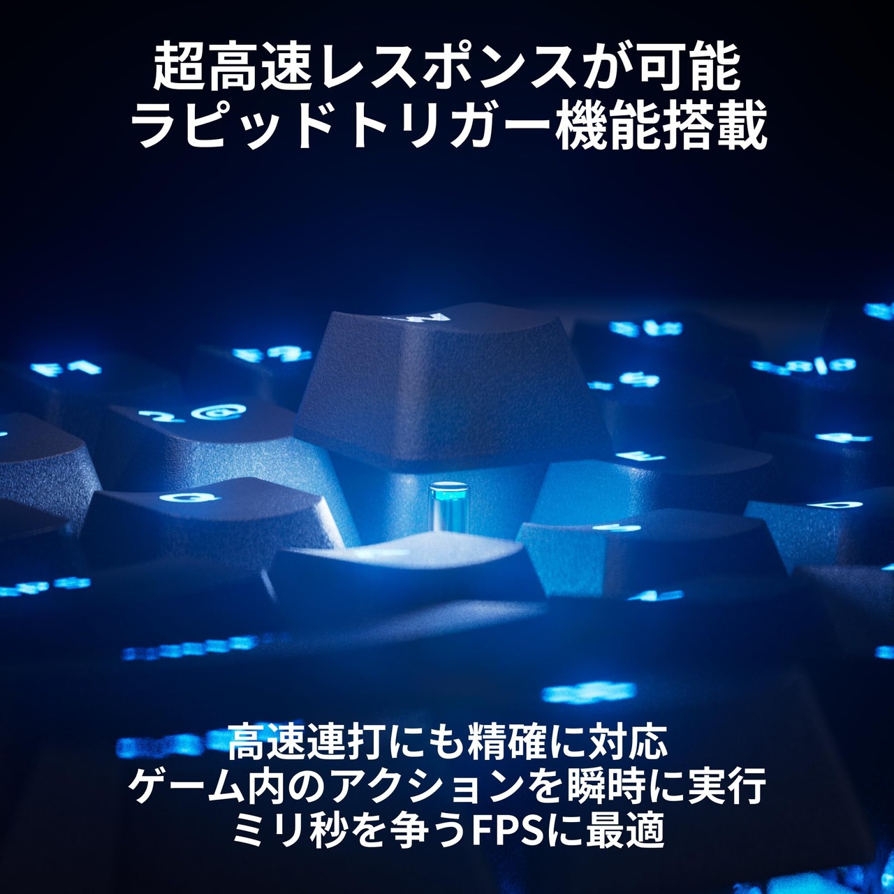 超高速反応のラピッドトリガー機能搭載/0.1mm単位、0.1~4.0mmの範囲で調整可能なアクチュエーションポイント/指を完全に離さずキー押下が可能、1ミリ秒を争うFPSゲームに最適