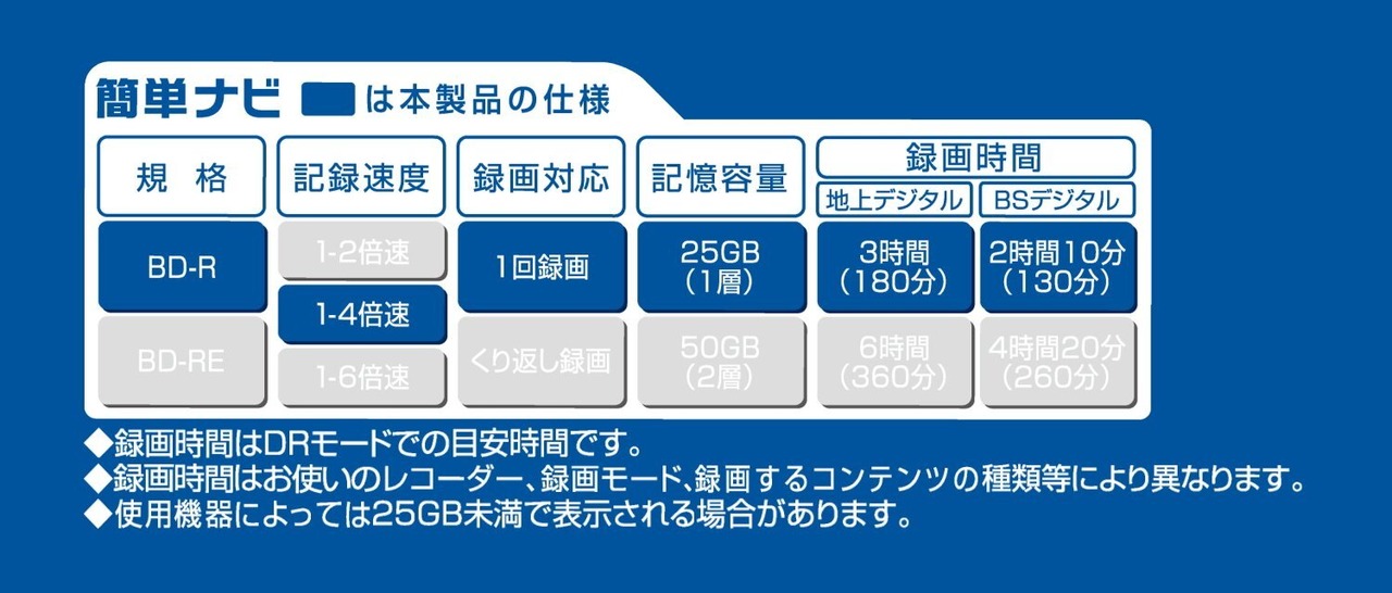 録画用BD-R(1回録画) 地デジ180分 BSデジ130分 25GB(片面1層)