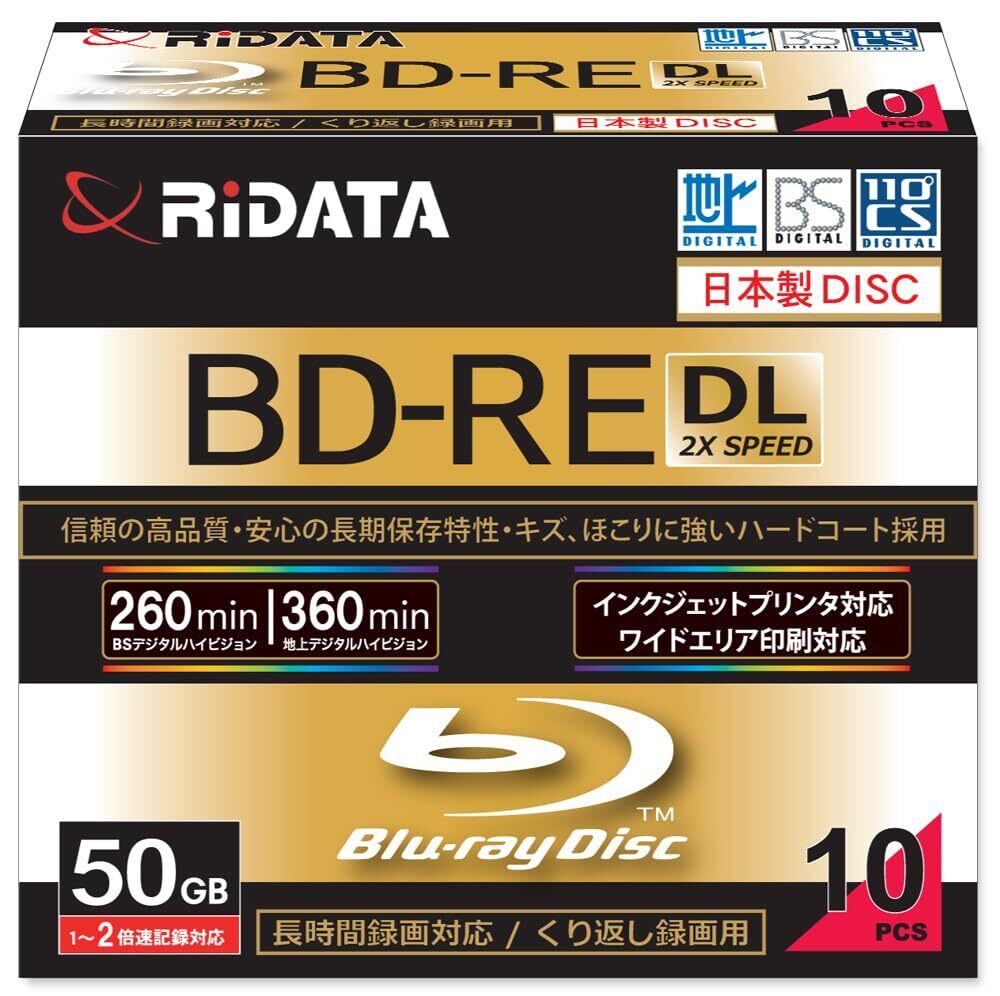 【記録面日本製 MID:MEI-T01-001 Panasonic品質】RiDATA(ライデータ) くり返し録画用 ブルーレイディスク BD-RE DL 50GB 10枚 ホワイトプリンタブル 片面2層 1-2倍速 スリムケース CBE260PW2X.10SC