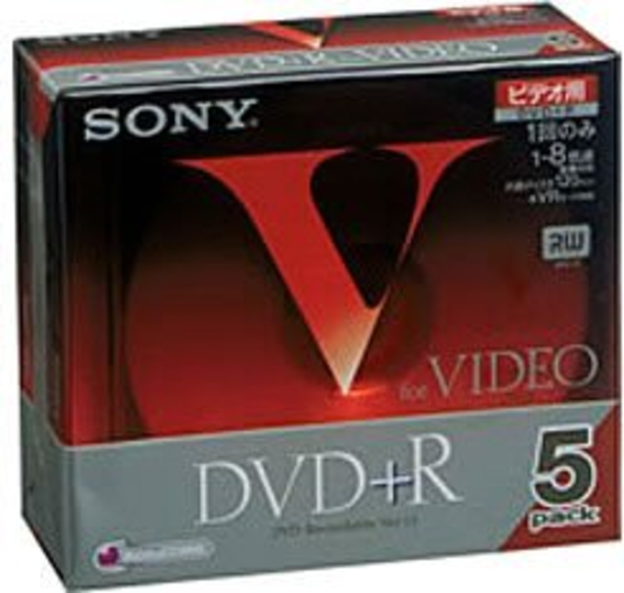 一回のみ録画が可能なDVD+R。ディスクレーベルは「V」のデザインが入った、高級感のあるシルバーディスク。1-8倍速記録対応(DVD+R for Ver.1.2に準拠)。AccuCORE採用により、安定した書き込み・再生を実現。インデックス機能付きバックカード。10mmケース採用。