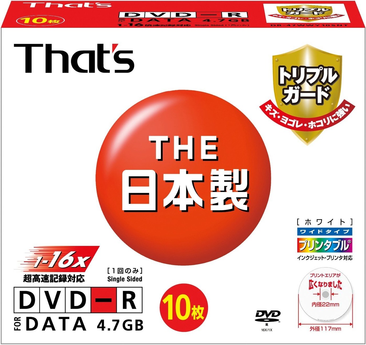 太陽誘電製 That's DVD-Rデータ用 16倍速4.7GB トリプルガード(ハードコート)ワイドプリンタブル 5mmPケース10枚入 DR-47WWY10SNT