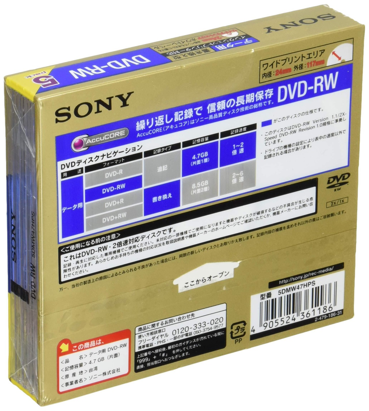 ソニー データ用DVD-RW 1-2倍速 5mmケース 5枚パック 5DMW47HPS