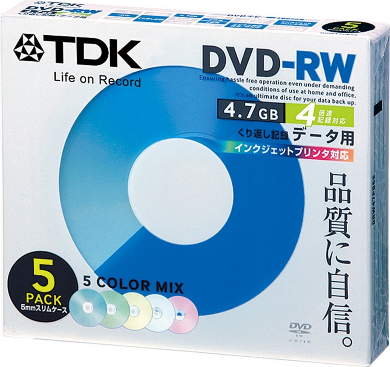 TDK データ用DVD-RW 4倍速対応 インクジェットプリンタ対応(カラーミックス) 5枚パック DRW47PMB5S