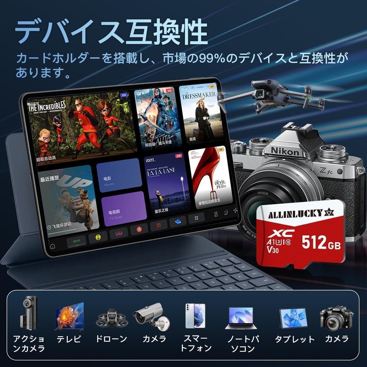 【512GBの大容量で大量データを簡単に保存】 この512GBのTFカード(マイクロSDカード)は、膨大なストレージ容量を提供し、数千時間の高画質ビデオ、数百万枚の高解像度写真、そして様々な大型アプリやゲームを簡単に保存できます。