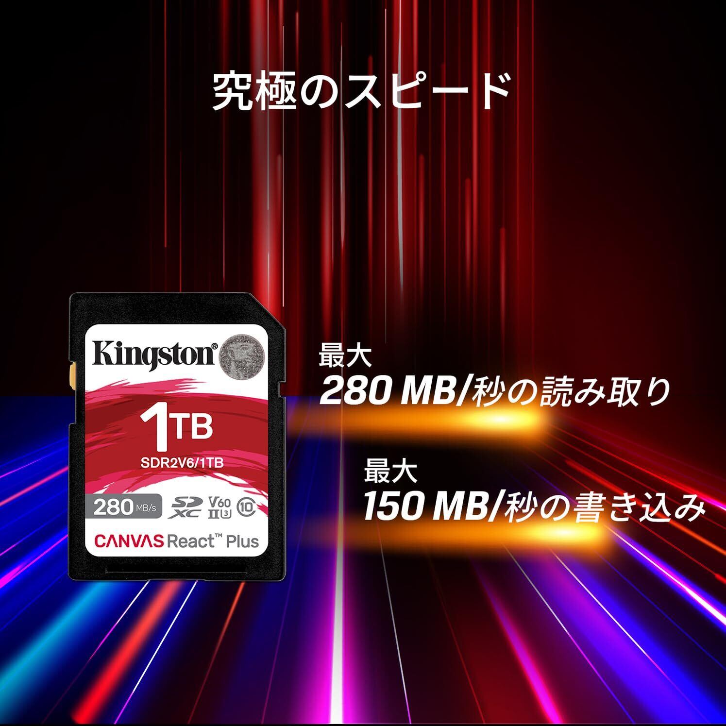 UHS-II 撮影の愛好家向けに設計された Kingston の Canvas React Plus V60 SD カードは、非常に優れたパフォーマンスを発揮し、UHS-I よりも高い毎秒ごとのフレーム数(fps)で 4K 撮影を行う標準の UHS-II カメラに理想的です。