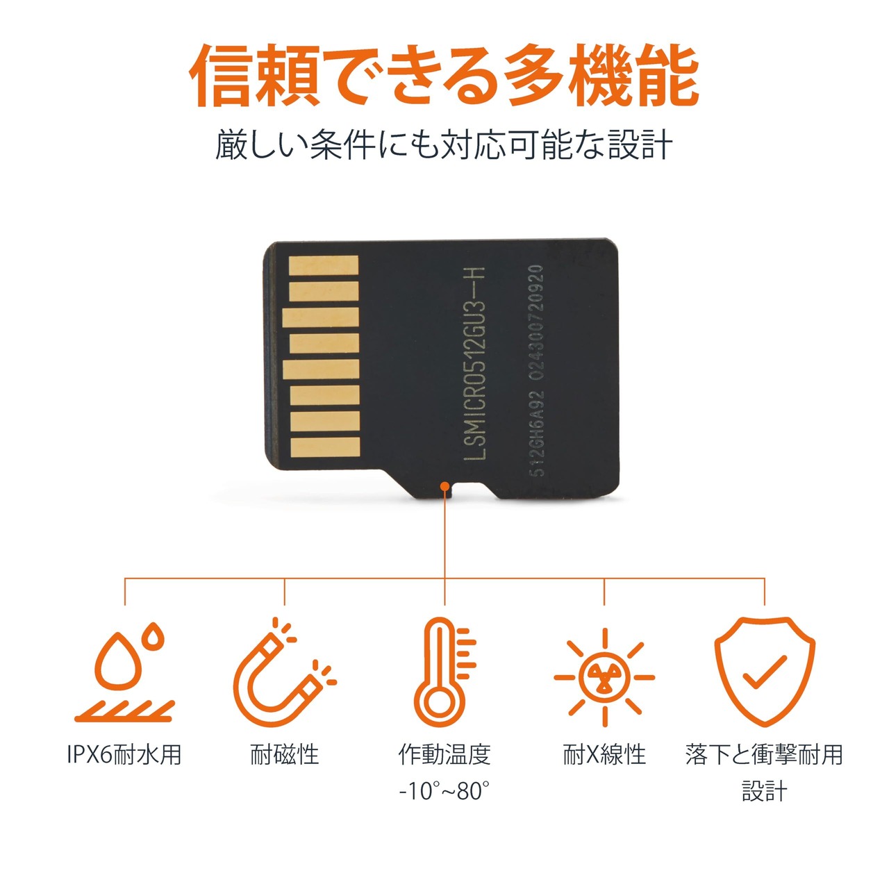 ご注意:異なるオペレーティング システムで表示される実際のストレージ容量は、測定基準の違いにより、製品ラベルに記載された容量よりも少ない場合があります。利用可能なストレージ容量は、465GB以上です。読み込みおよび書き込み速度は、管理された条件下で実施された内部テストに基づいています。実際の速度は、使用するデバイス、インターフェース、使用条件およびその他の要因によって異なる場合があります。お使いのデバイスがマイクロSD容量に対応することをご確認ください。例えば、デバイスが最大容量64GBのみをサポートしている場合、このマイクロSDの全容量512GBが認知されない可能性があります。