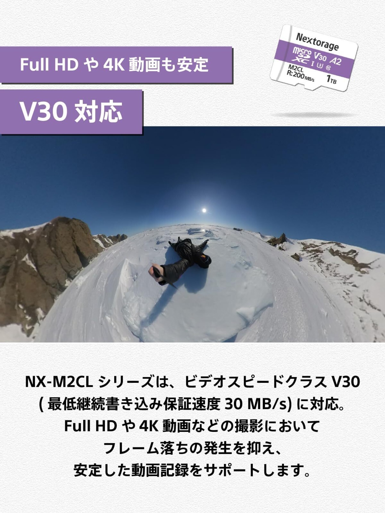 安定した動画記録をサポート:V30に準拠。最低継続書き込み速度30 MB/sがされています。高画質動画撮影でもフレーム落ちを最小限に抑え、安定した動画記録をサポート