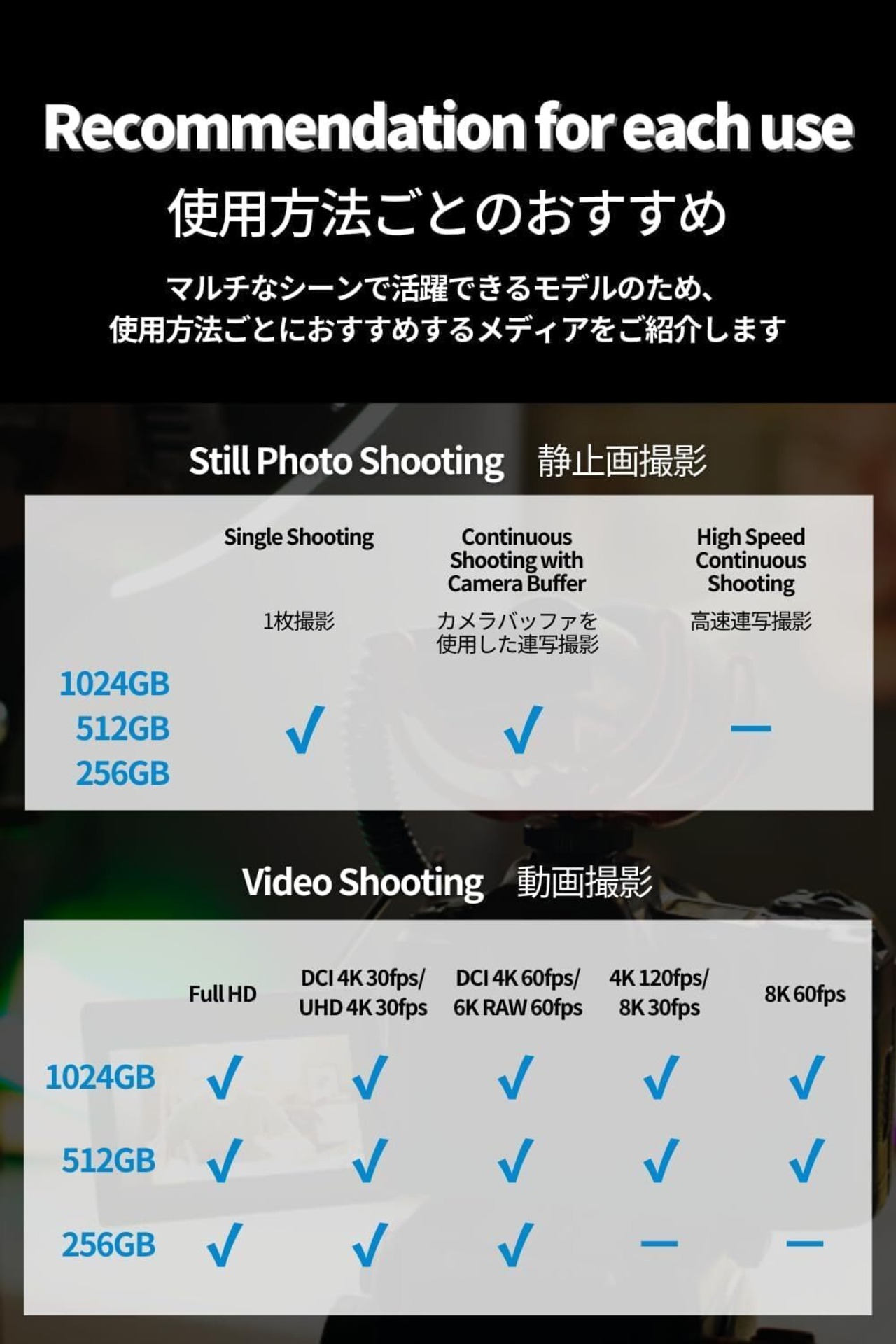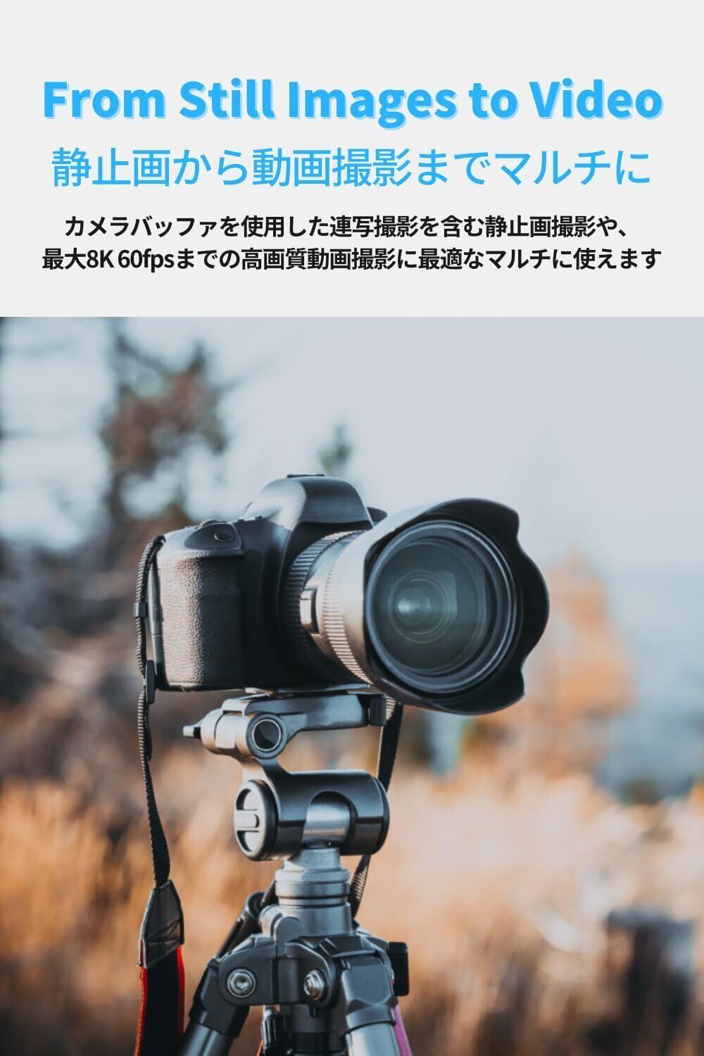 静止画から動画撮影までマルチに使えるエントリーモデル:カメラバッファを使用した連写撮影を含む人物や風景の静止画撮影や、最大8K 30fpsまでの高画質動画撮影に最適なCFexpress Type Bメモリーカードです。