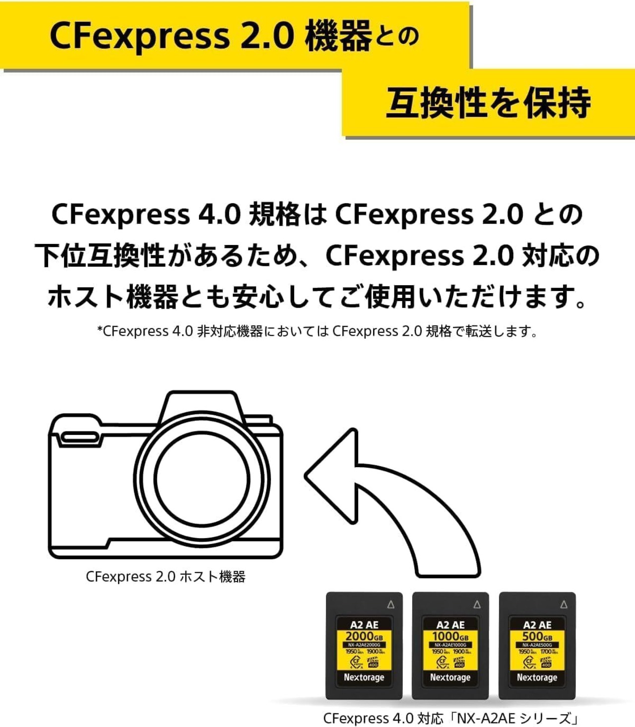 CFexpress2.0機器とも下位互換:CFexpress4.0規格はCFexpress2.0との下位互換性があるため、現行のCFexpress2.0対応のホスト機器とも安心してご使用いただけます。