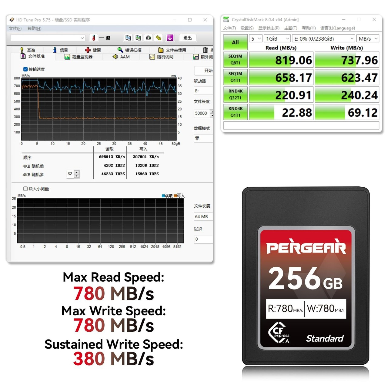 安定したパフォーマンス: Pergear 256GB cfexpress タイプAカードは、最大読み取り速度780MB/秒、最大書き込み速度780MB/秒、持続書き込み速度380MB/秒を実現します。ご注意:速度は内部テストに基づき、実際の転送速度および容量は、ホストデバイス、ファイル属性、システムハードウェアおよびその他の要因によって異なる場合があります。