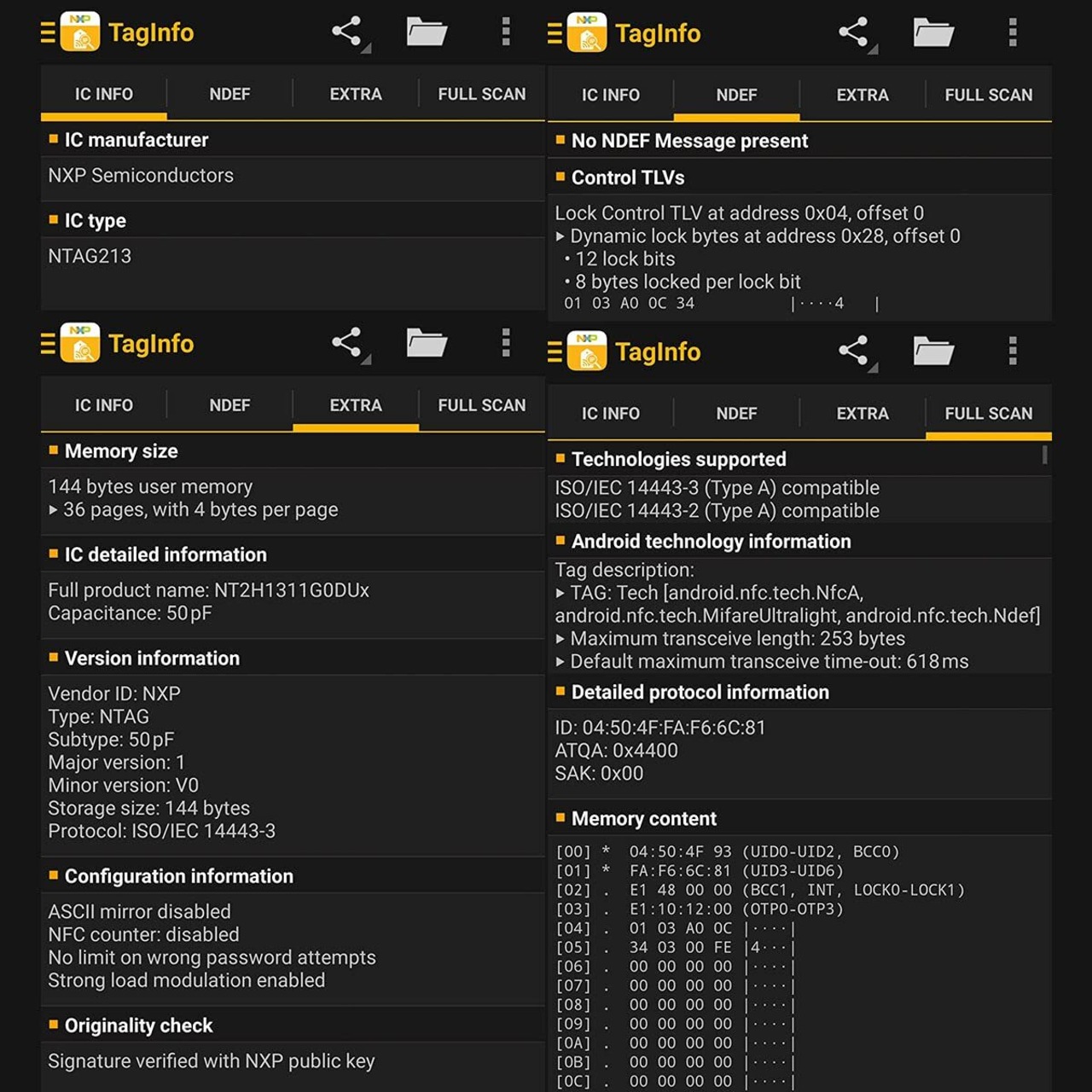 - チップNXP NTAG 213, 144バイトのメモリが, nfcのツールとnfcのタスクによって、アプリケーショ ンをタグに開いたり閉じたりするような一連のコマンドをプログラムする。
