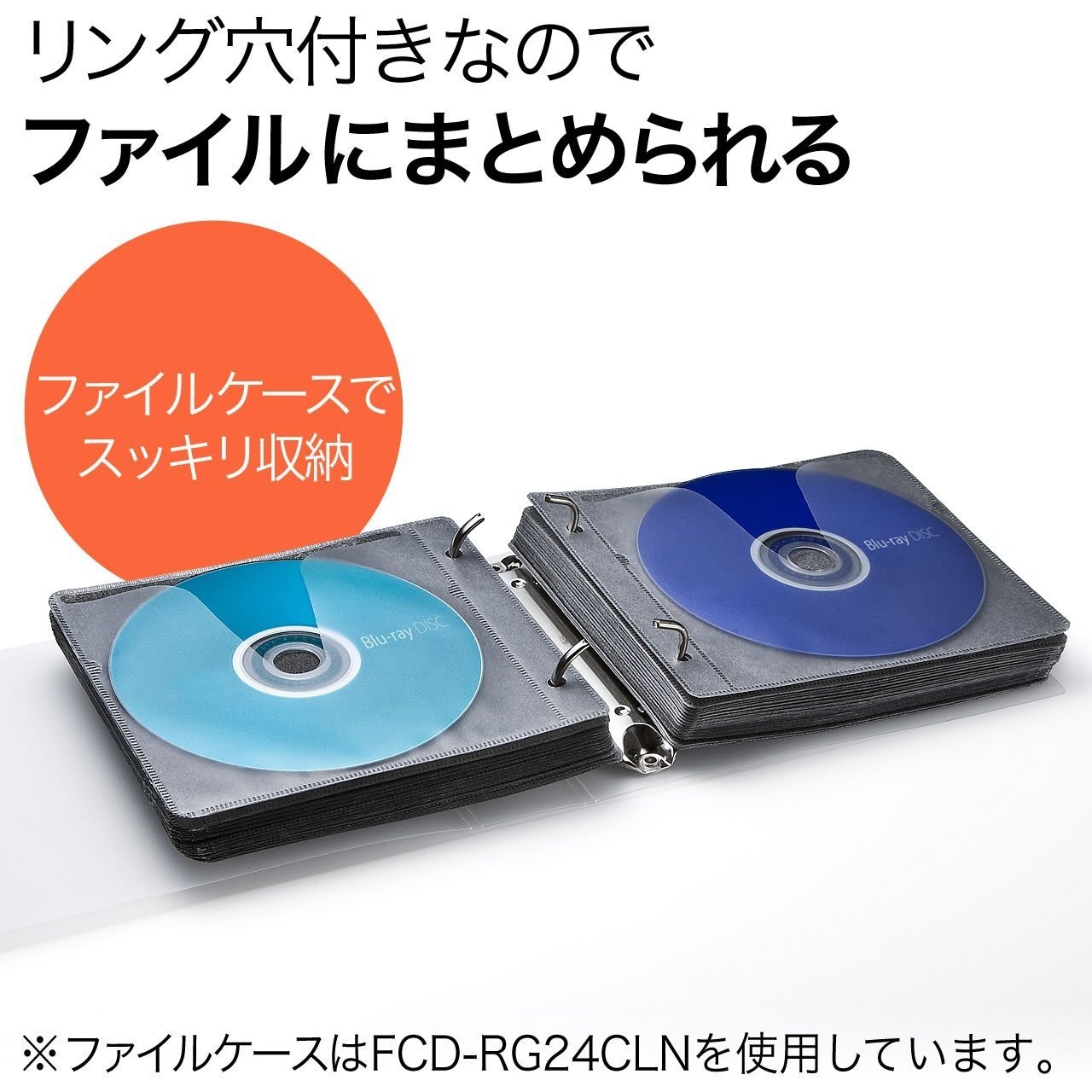ジャケットカードが収納可能で、表にメディア、裏にジャケットカードというような収納も行えます。ファイリングできる2穴付タイプで、別売りのサンワサプライ製専用ファイル「FCD-RG24CLN」、「FCD-RG36CLN」にファイルできます。